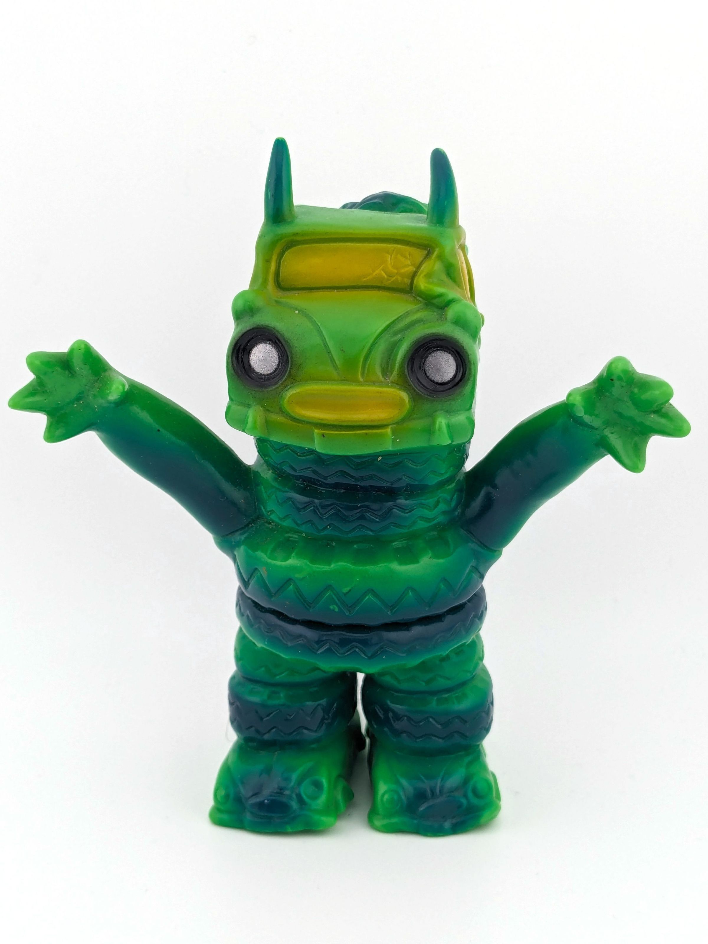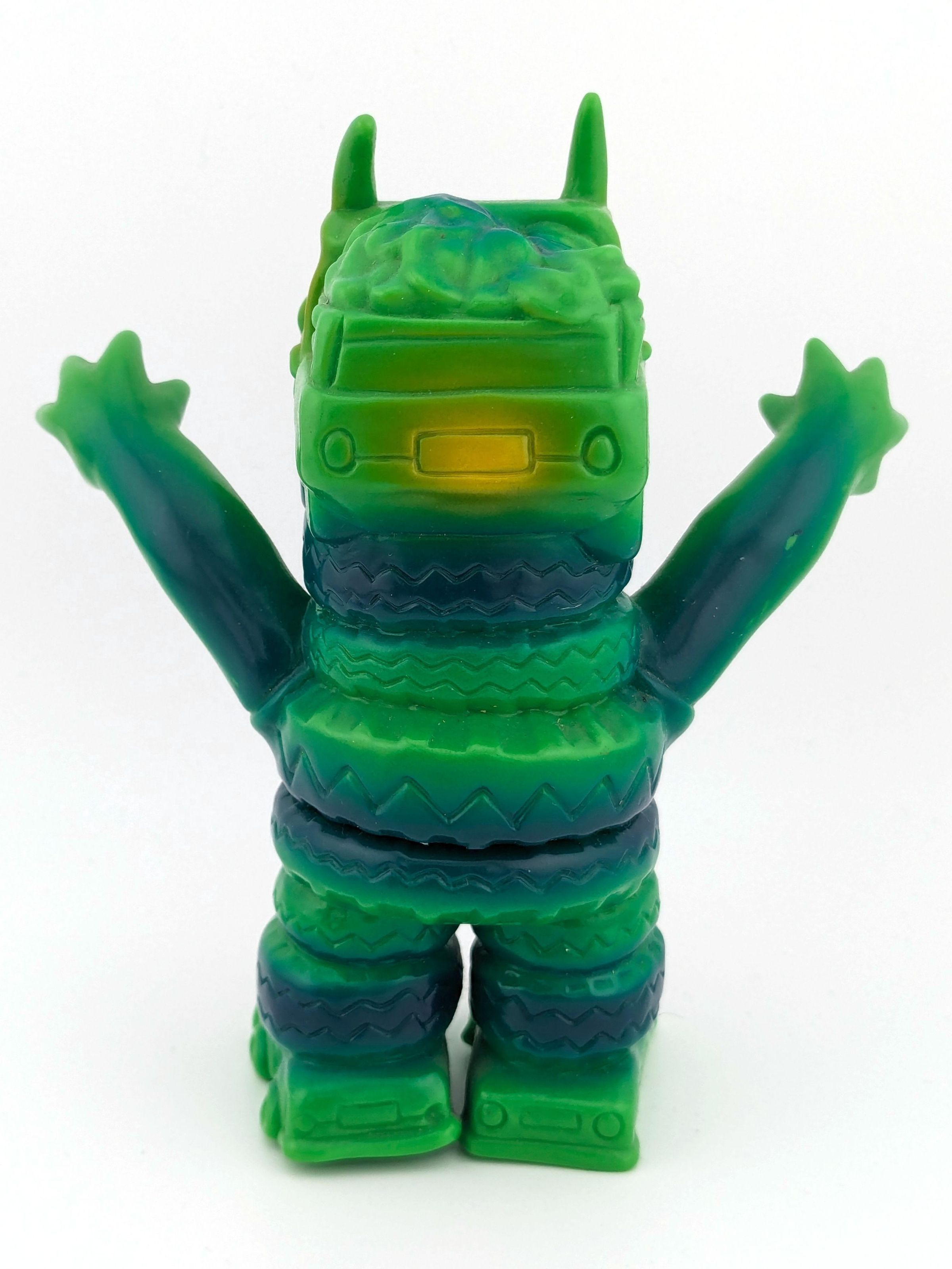 Green vinyl with blue, yellow, black, and silver paint