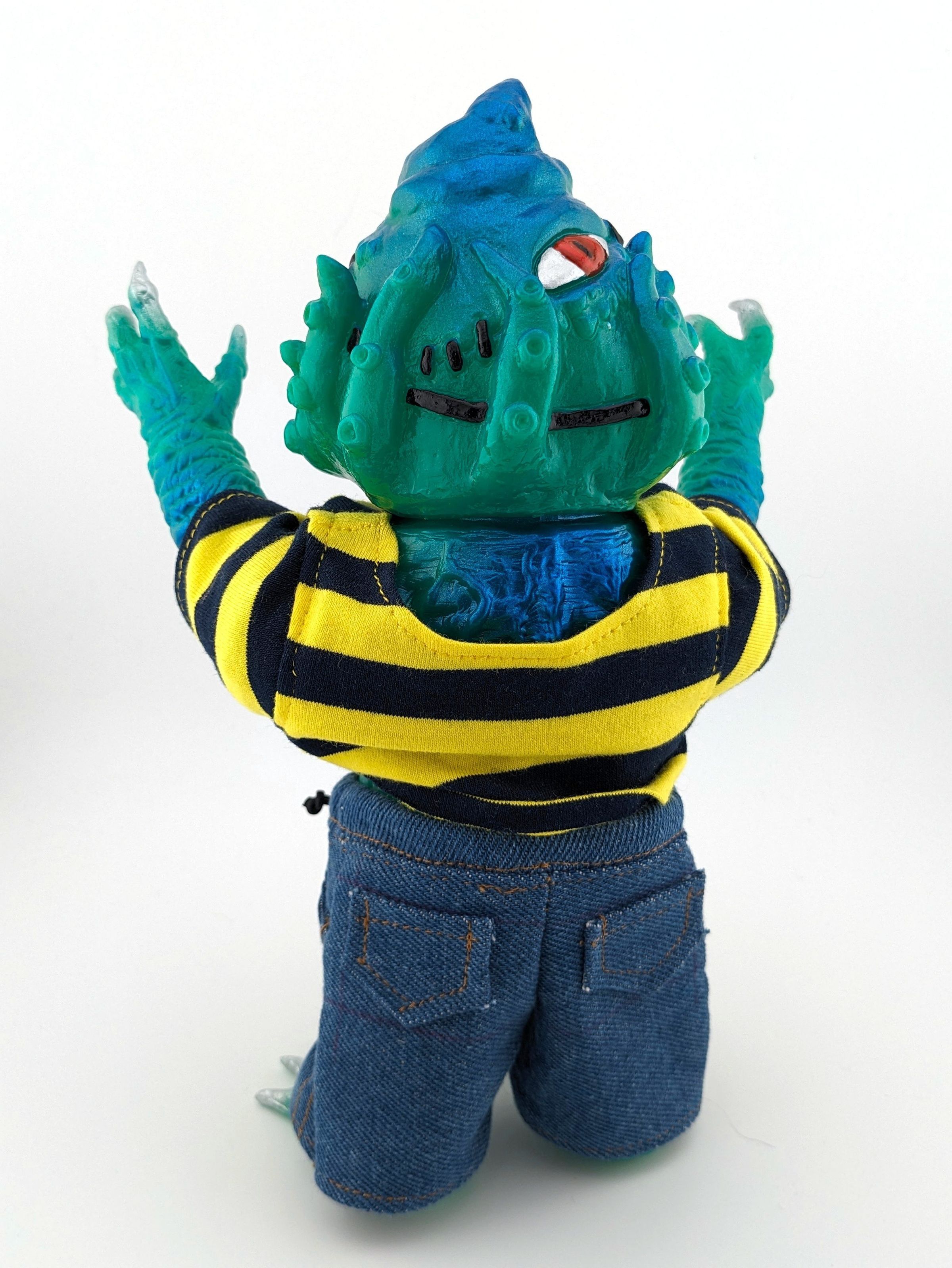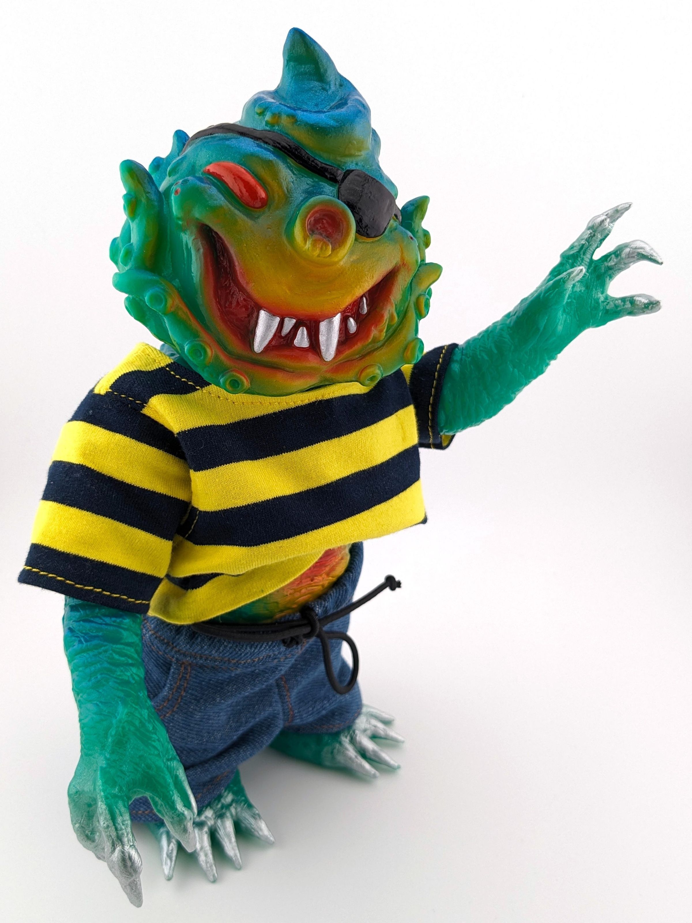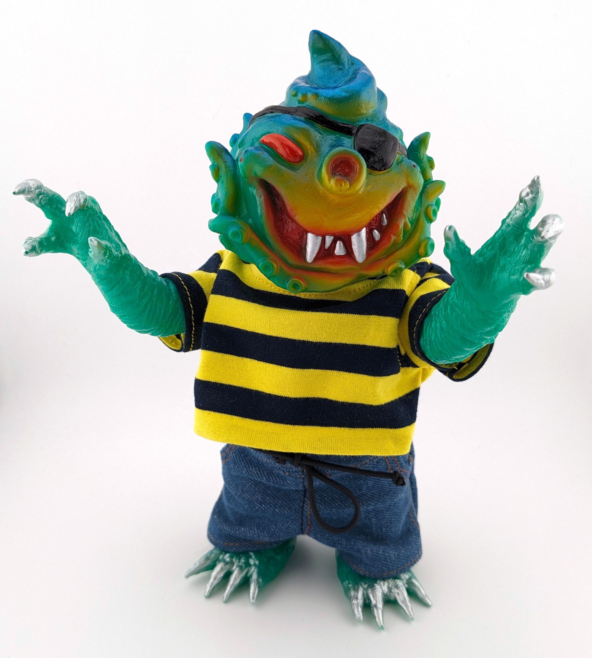 Green vinyl with blue, red, yellow, silver, and black paint; with red and black striped shirt and blue jeansMade/Created