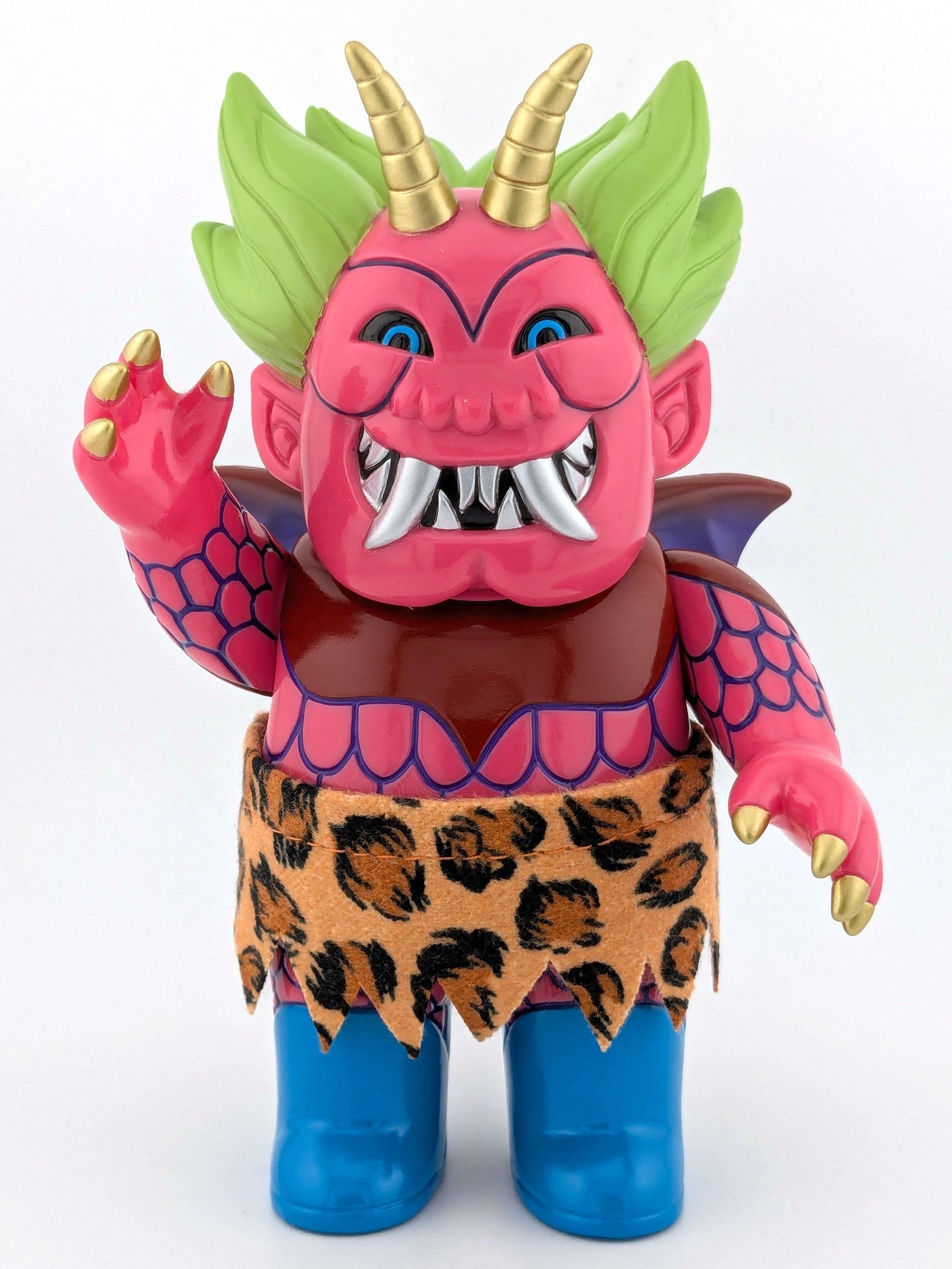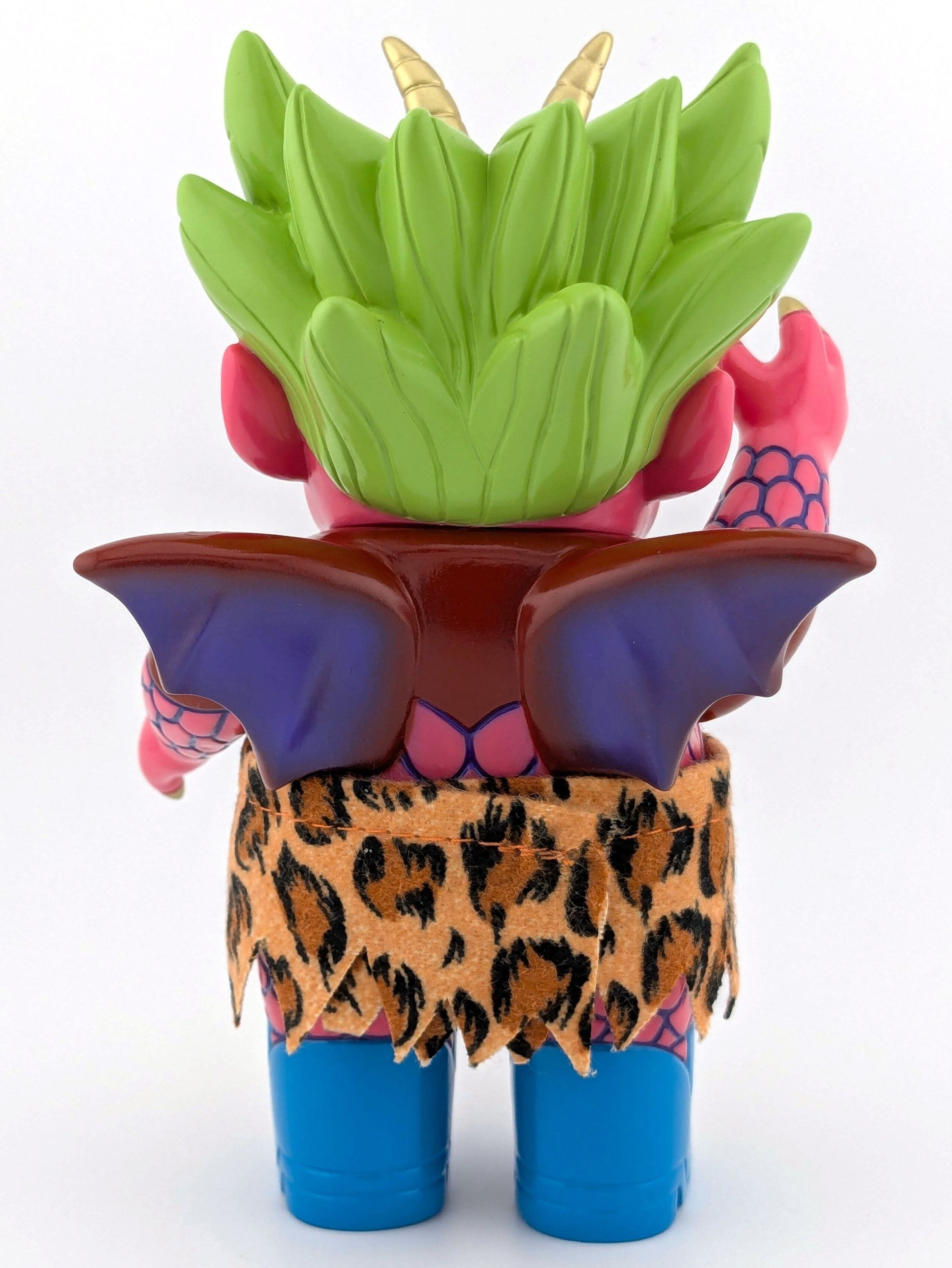 Pink vinyl with red, light green, blue, and gold paint