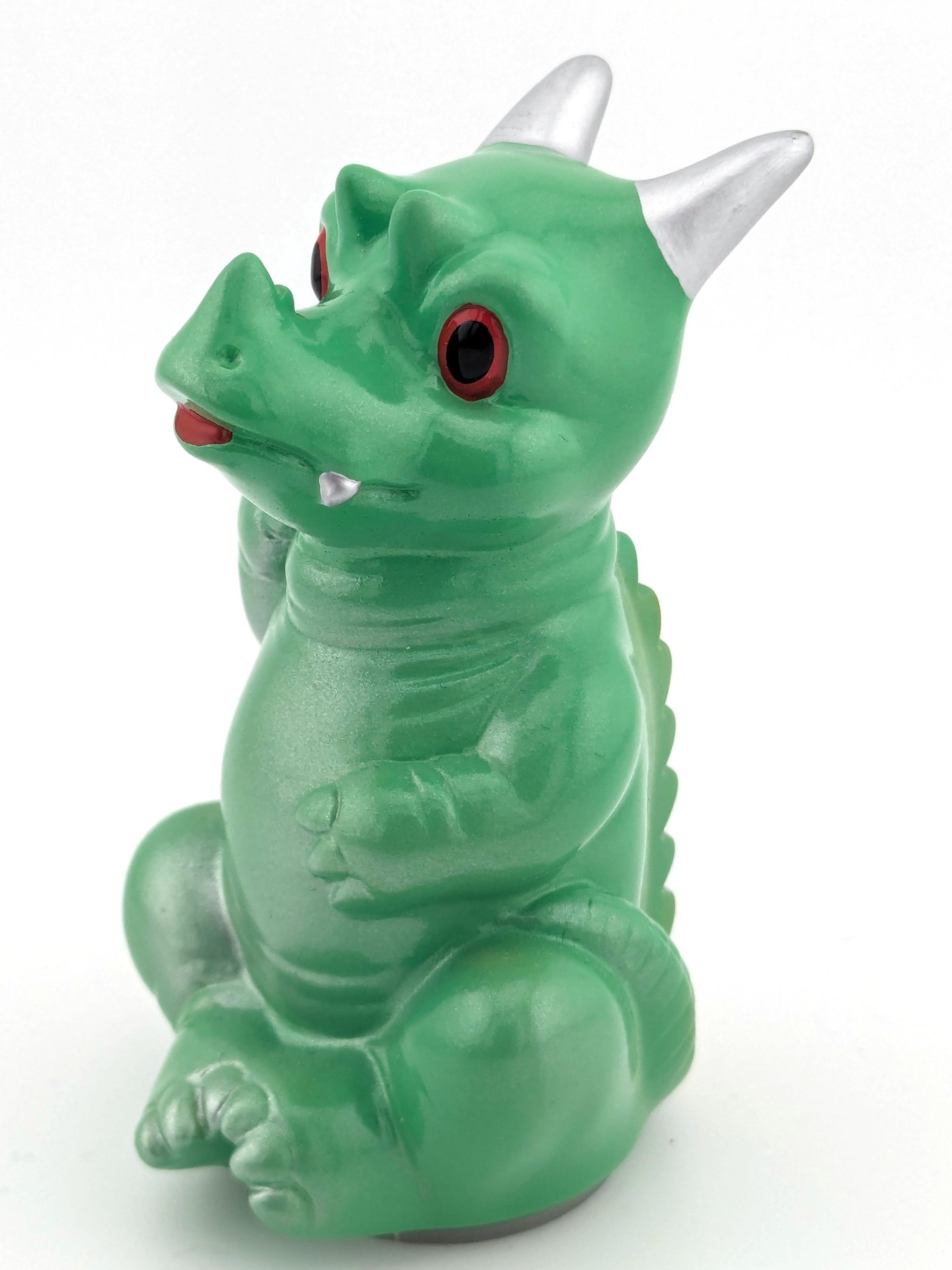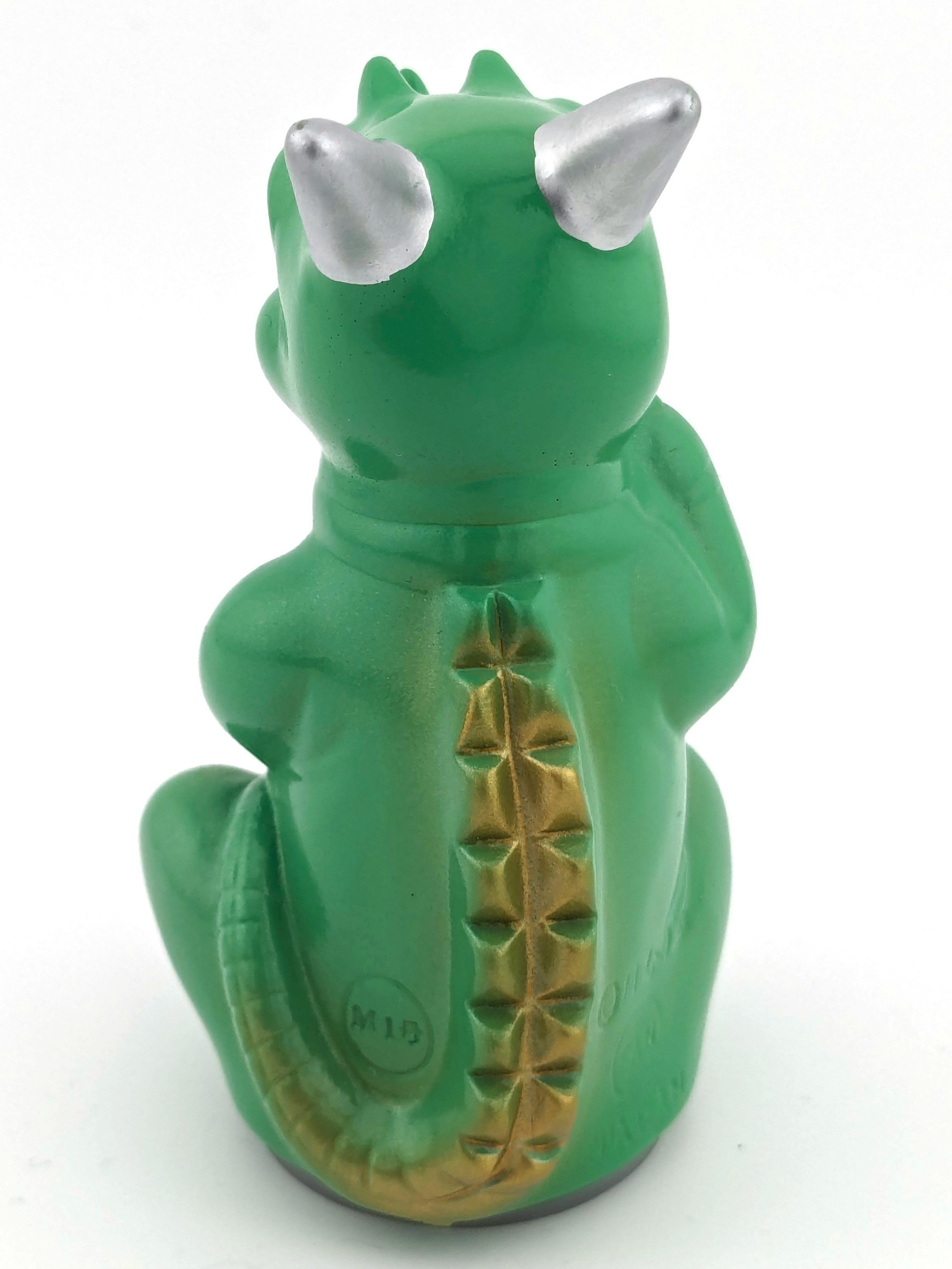 Flesh vinyl overpainted with light green, silver, red, black, and gold paint