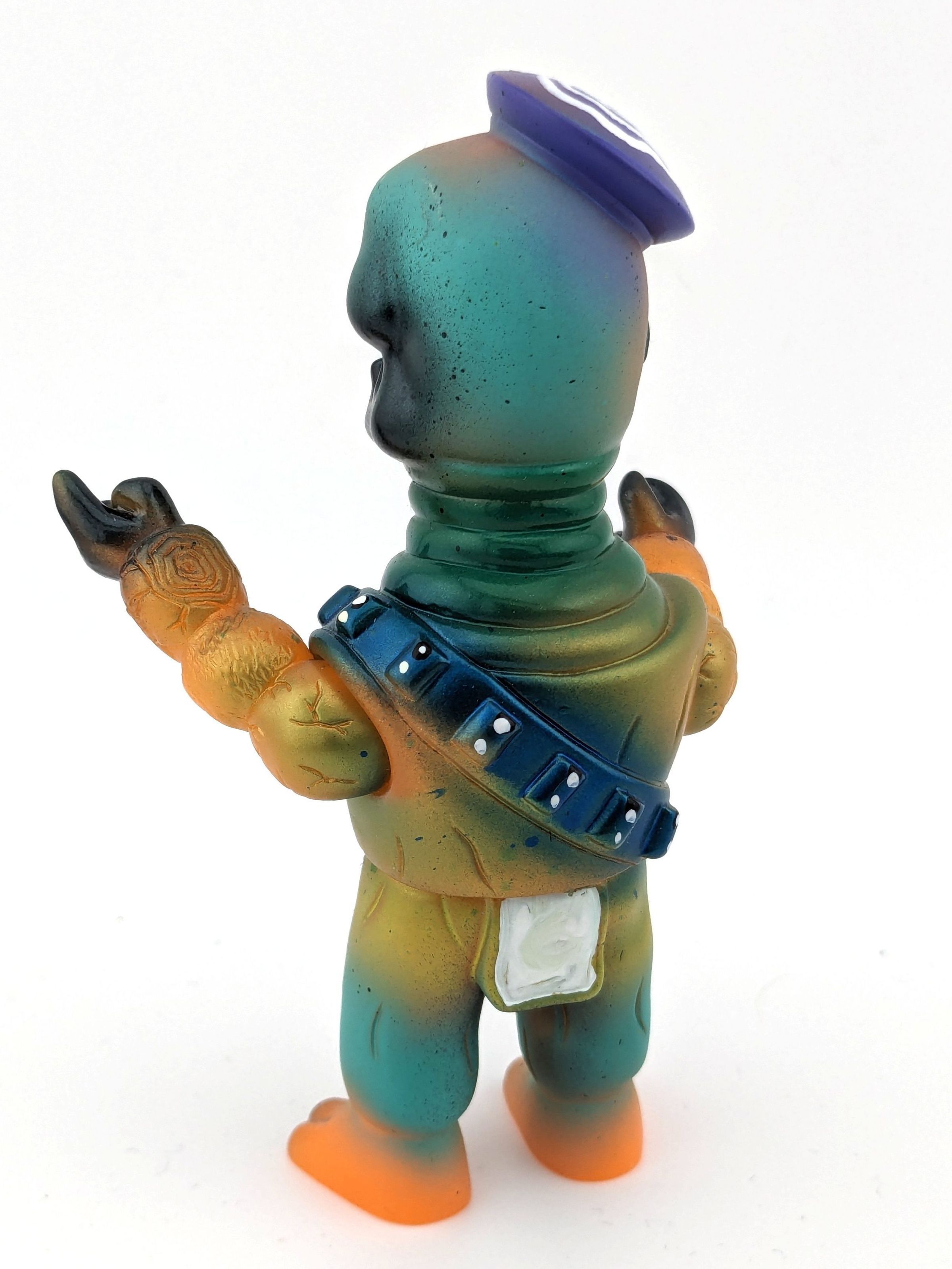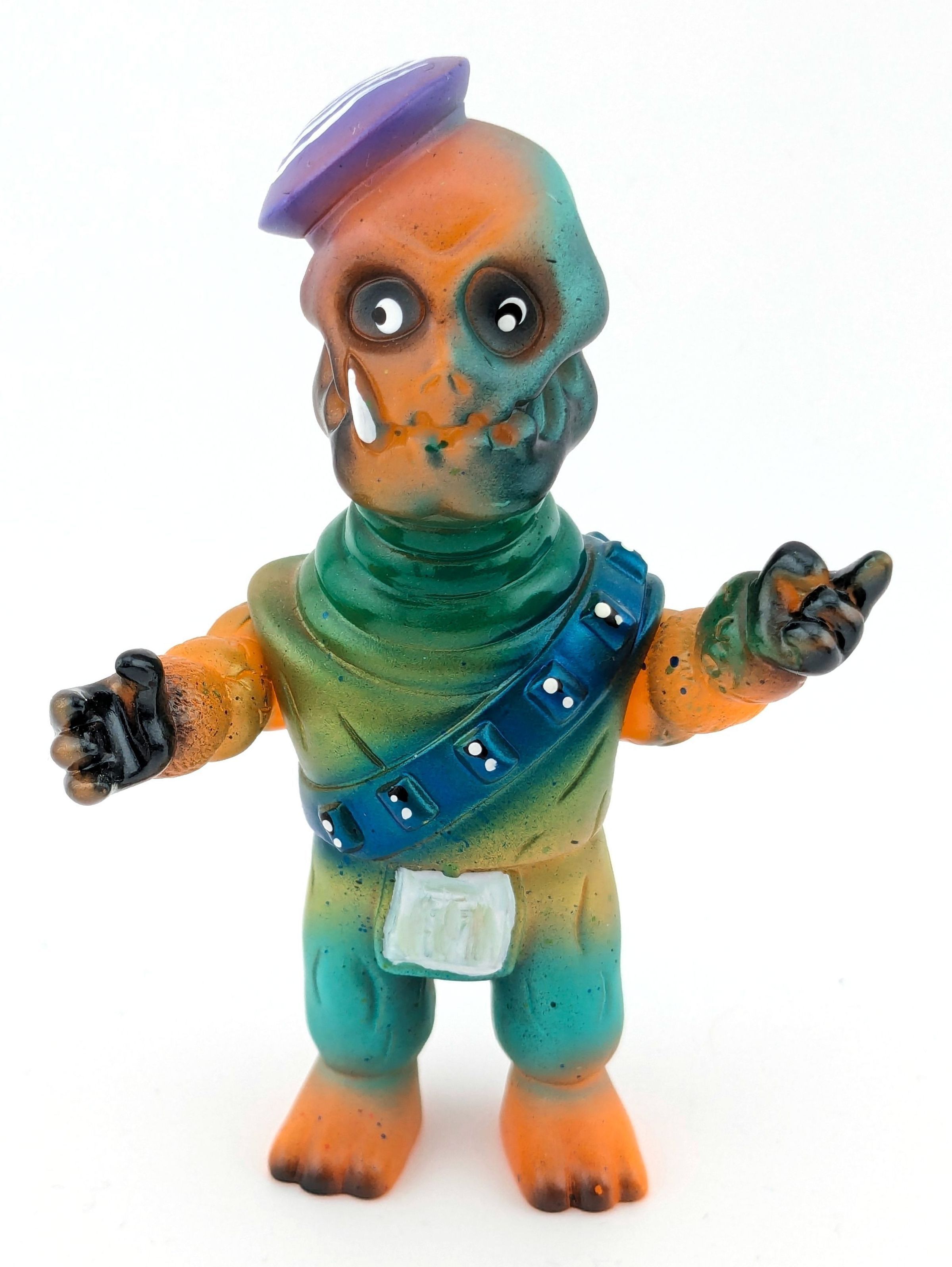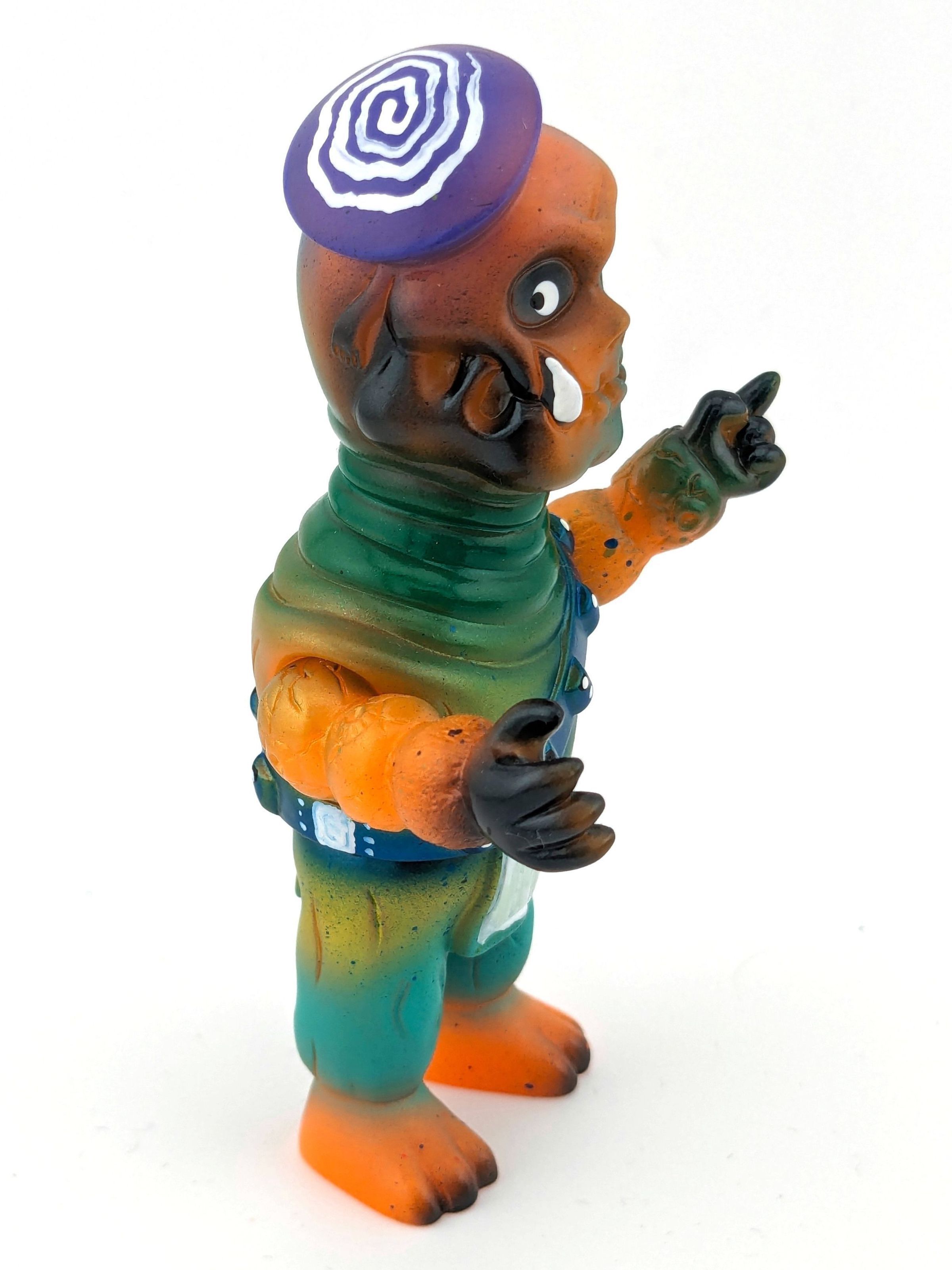 Orange vinyl with purple, white, black, green, and metallic blue paint