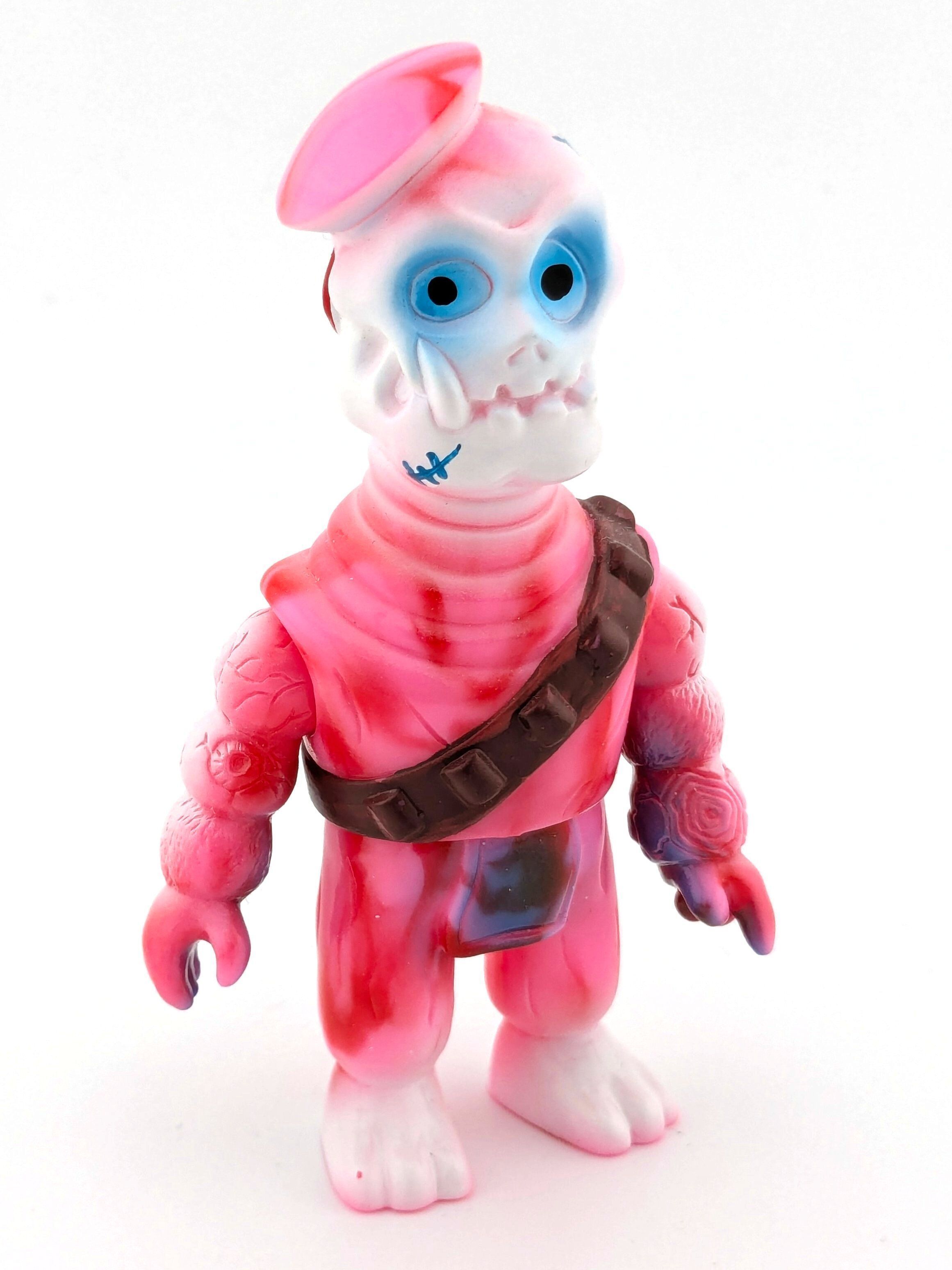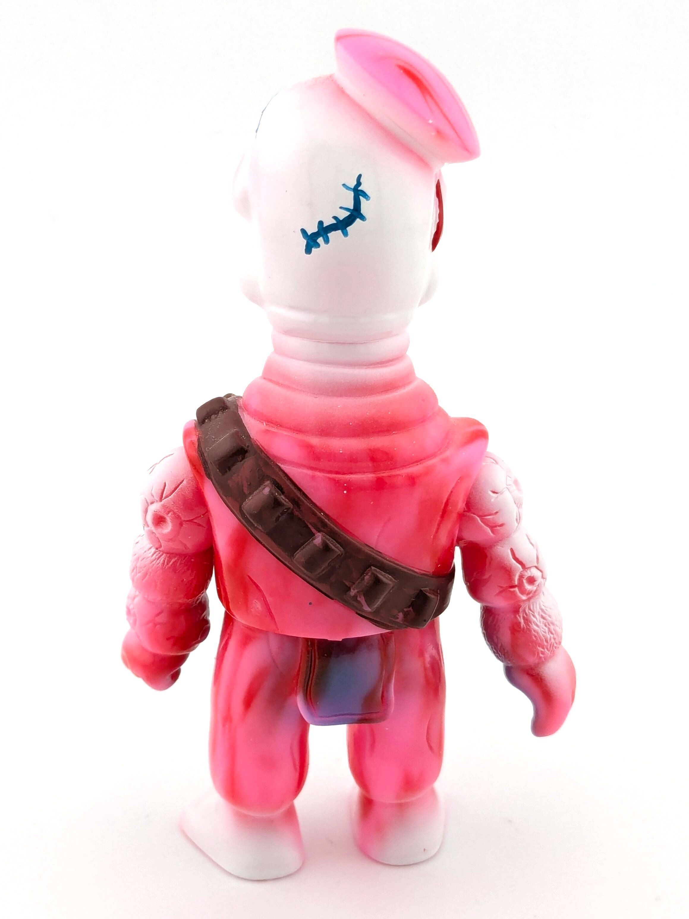 Pink and white marbled vinyl with blue, white, and brown paint