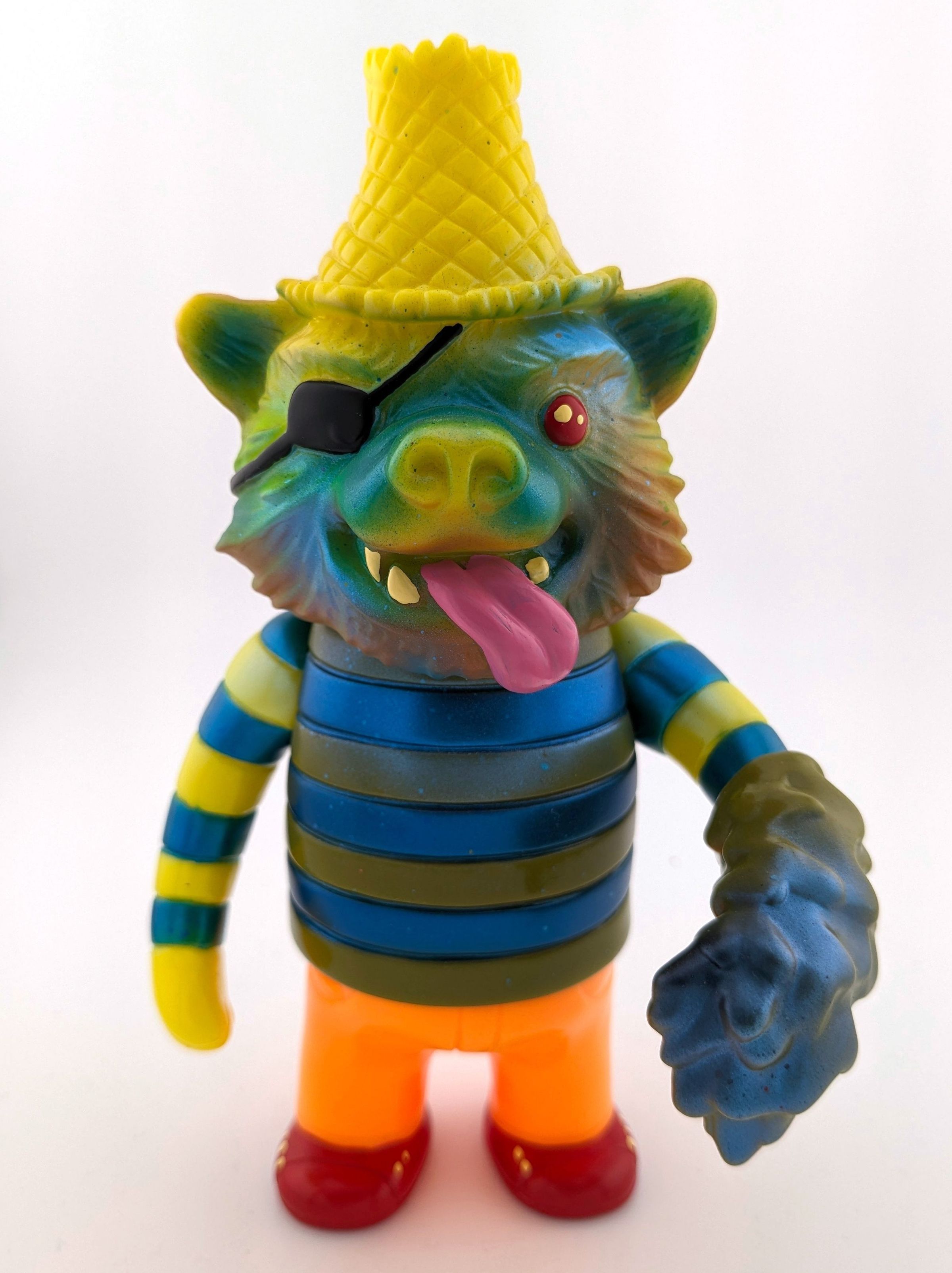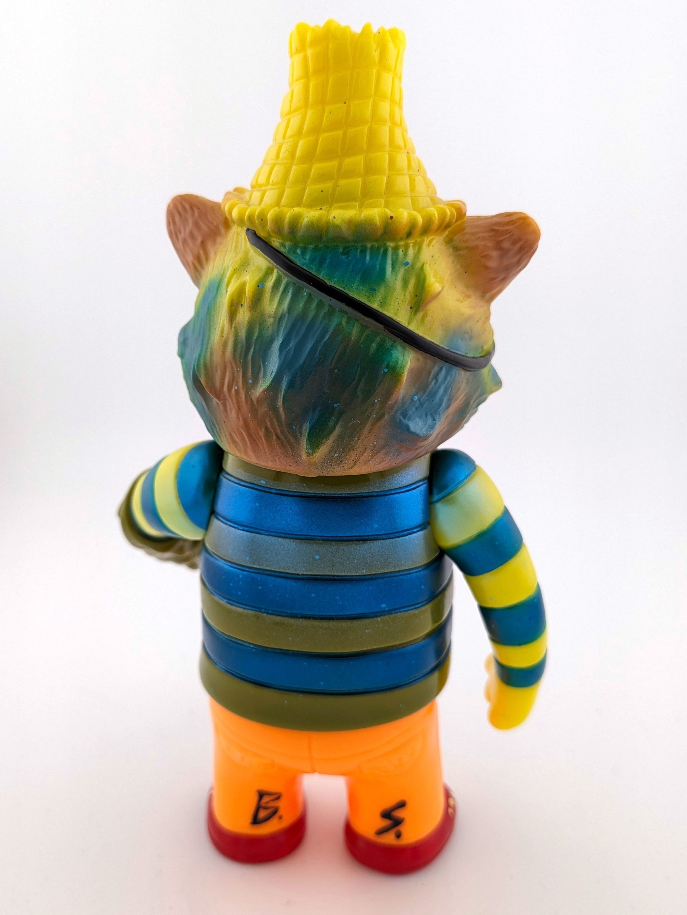 Yellow, orange, and olive green vinyl with black, red, white, metallic green, metallic blue, pink and brown paint