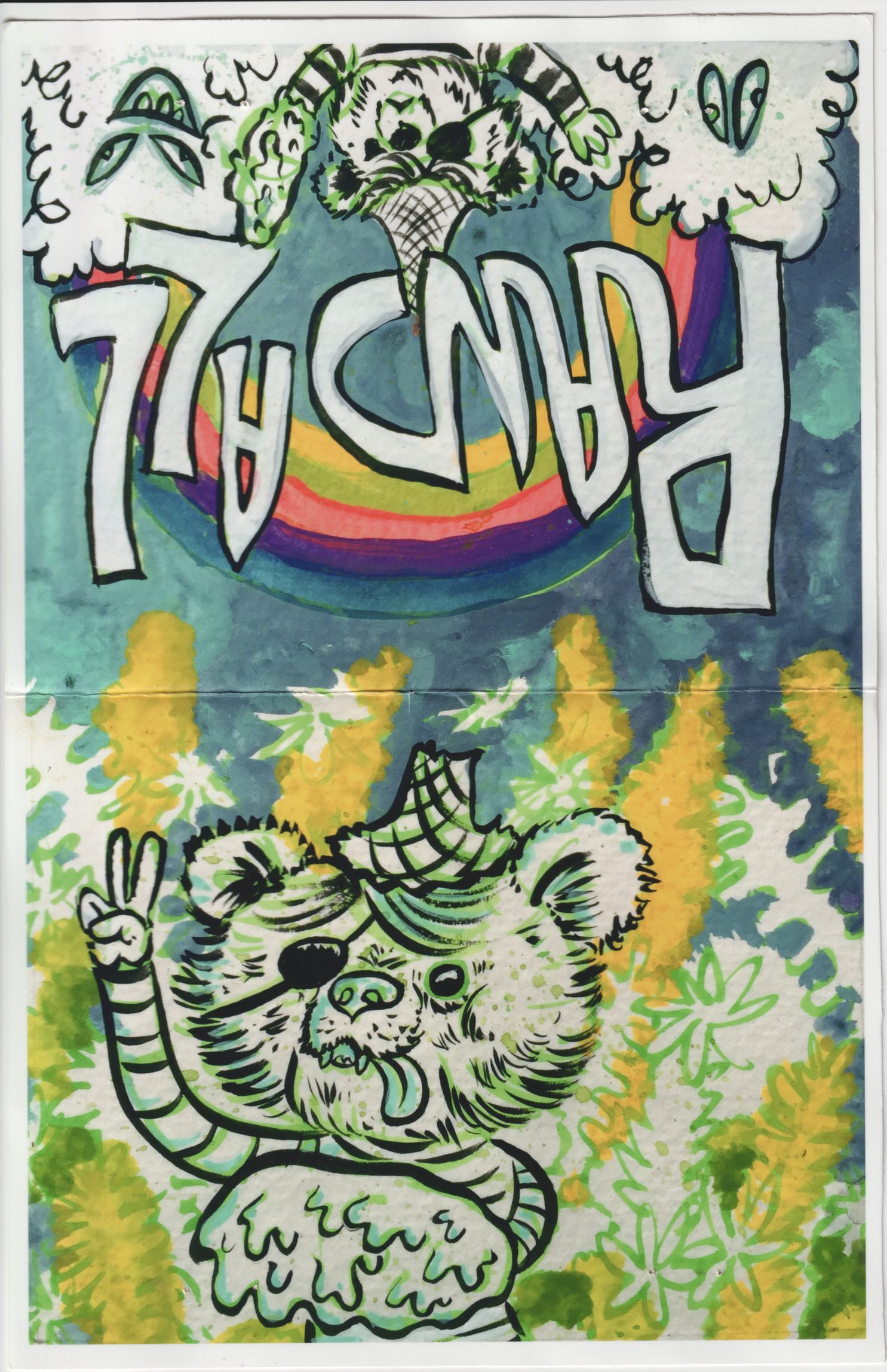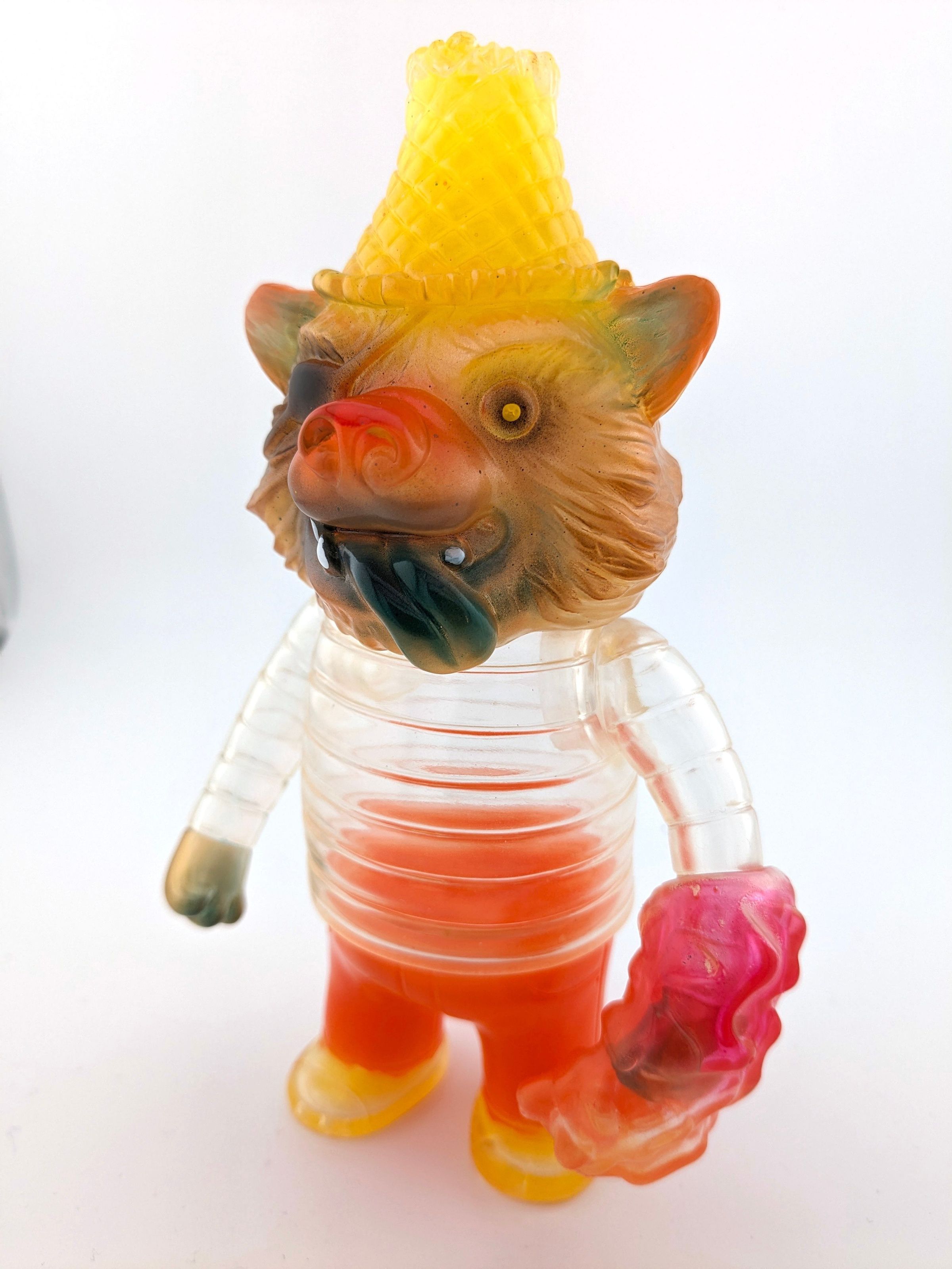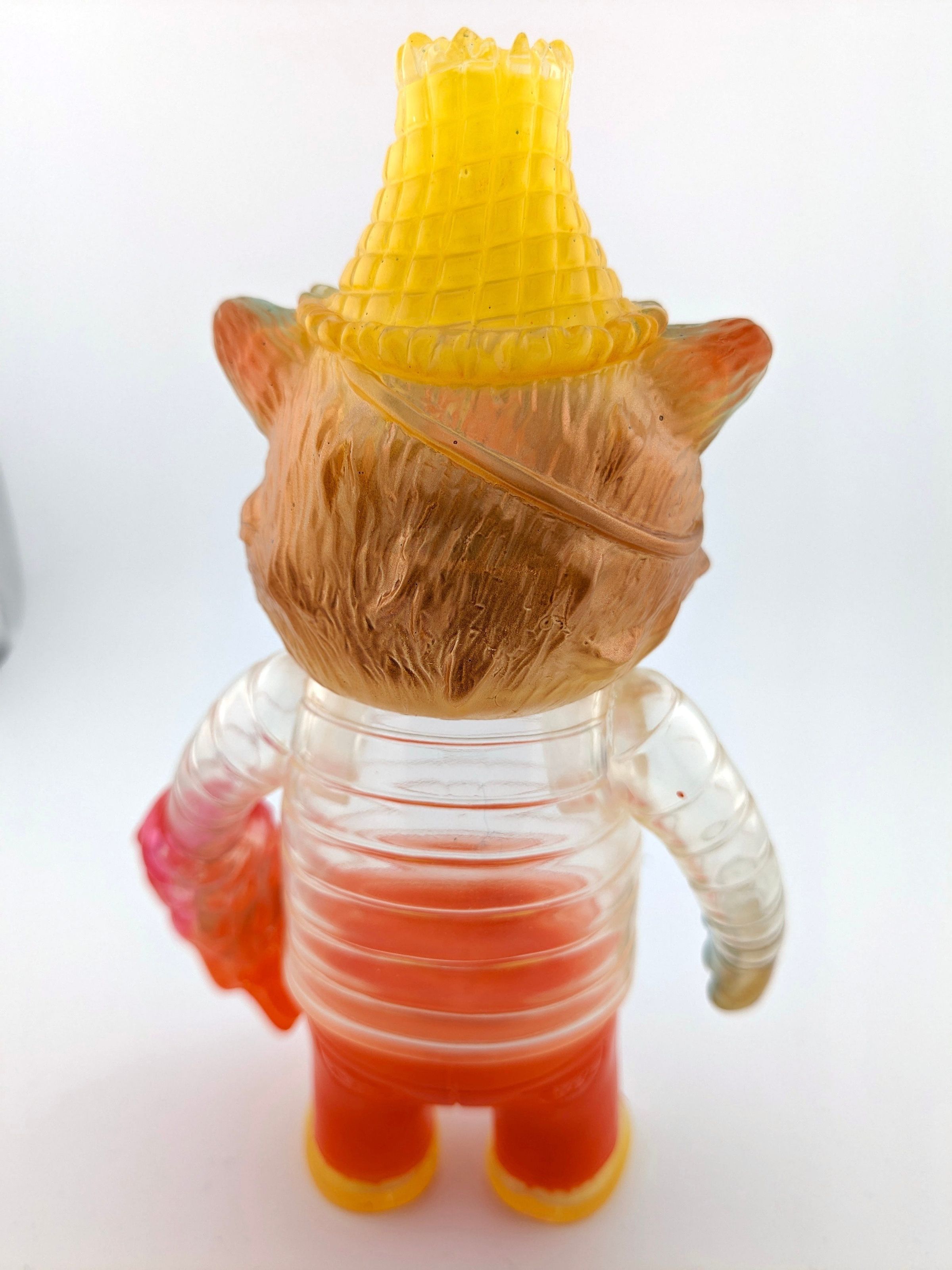 Clear vinyl with yellow, orange, red, blue, black, white, and gold paint