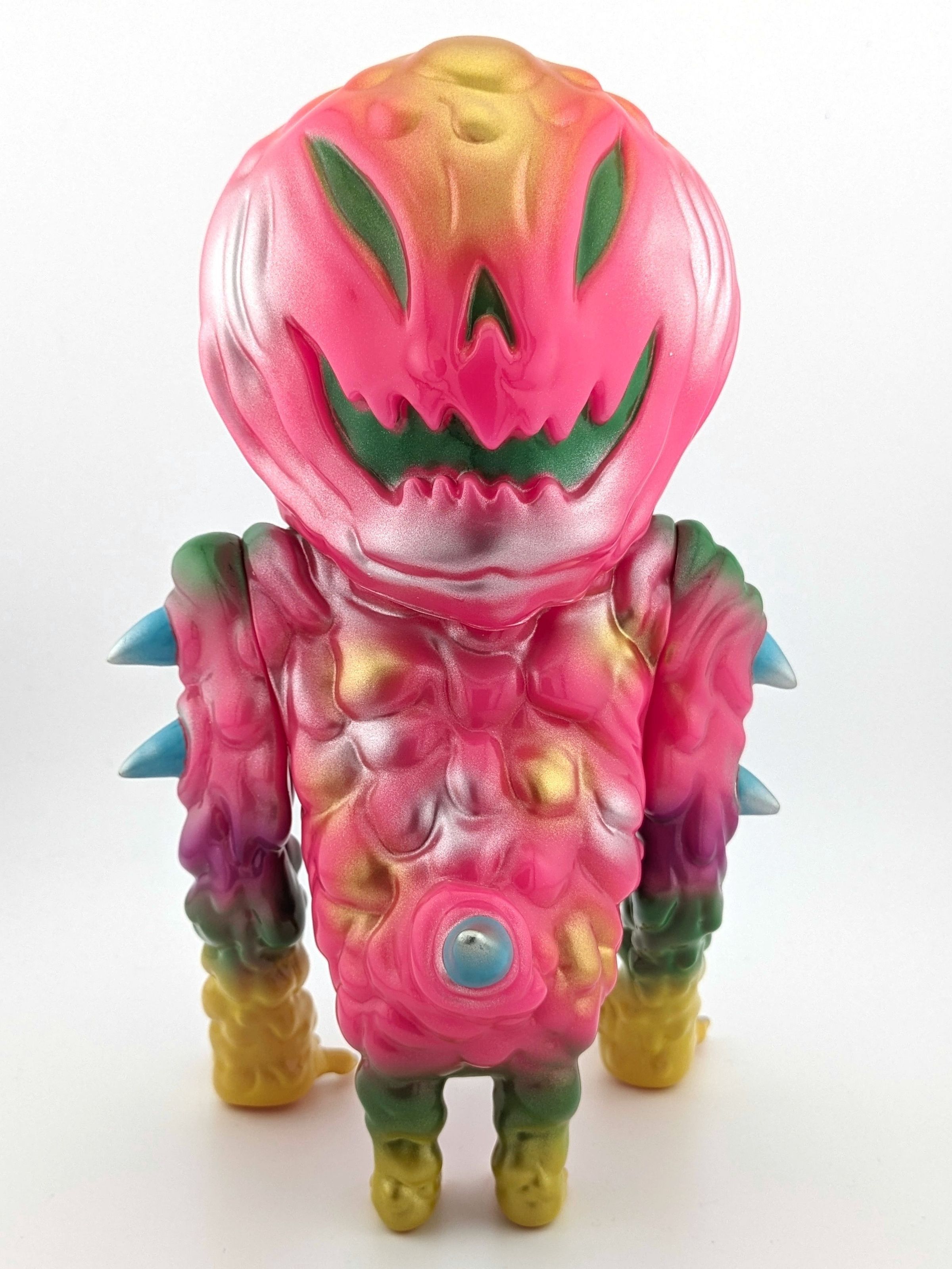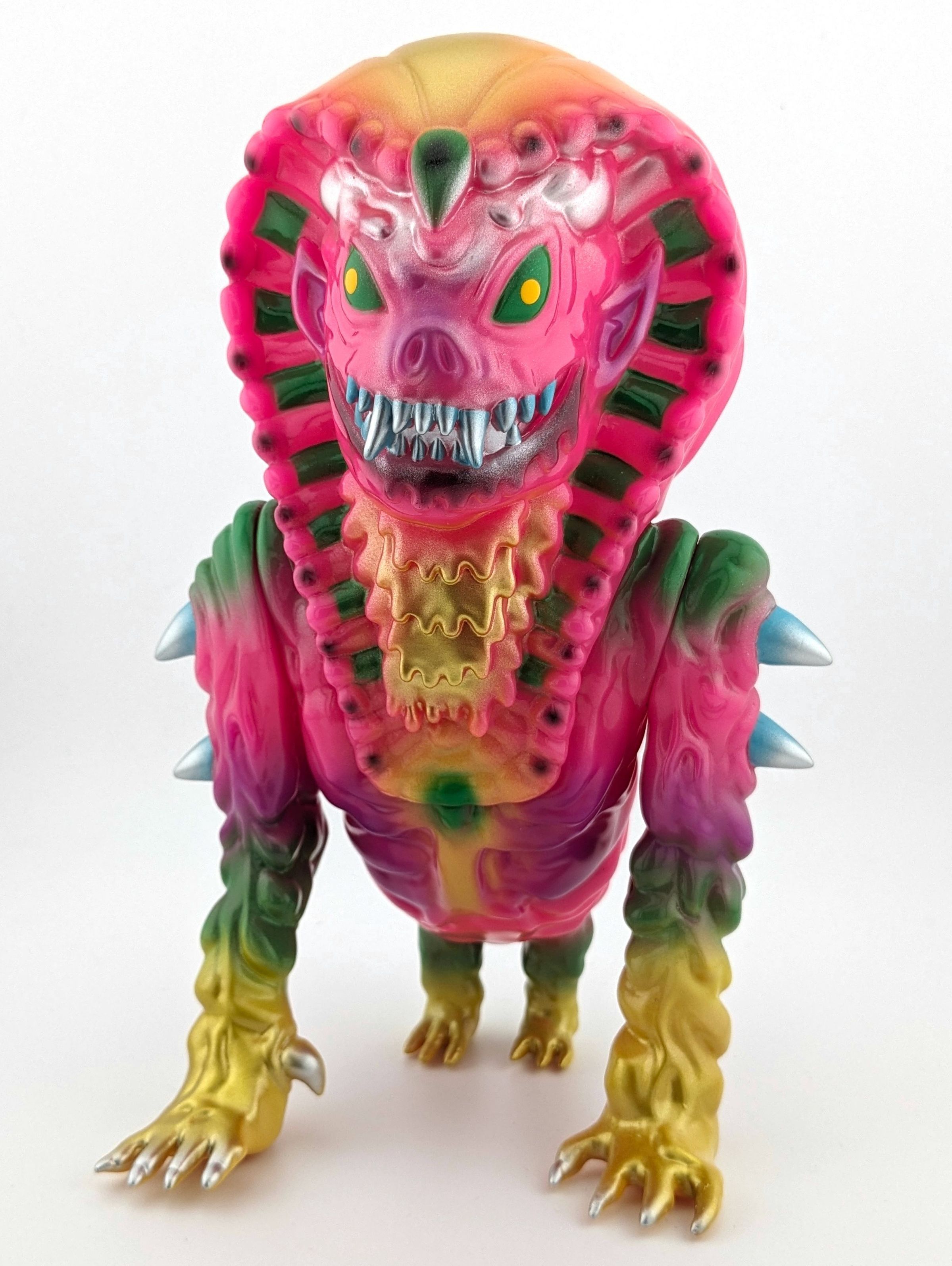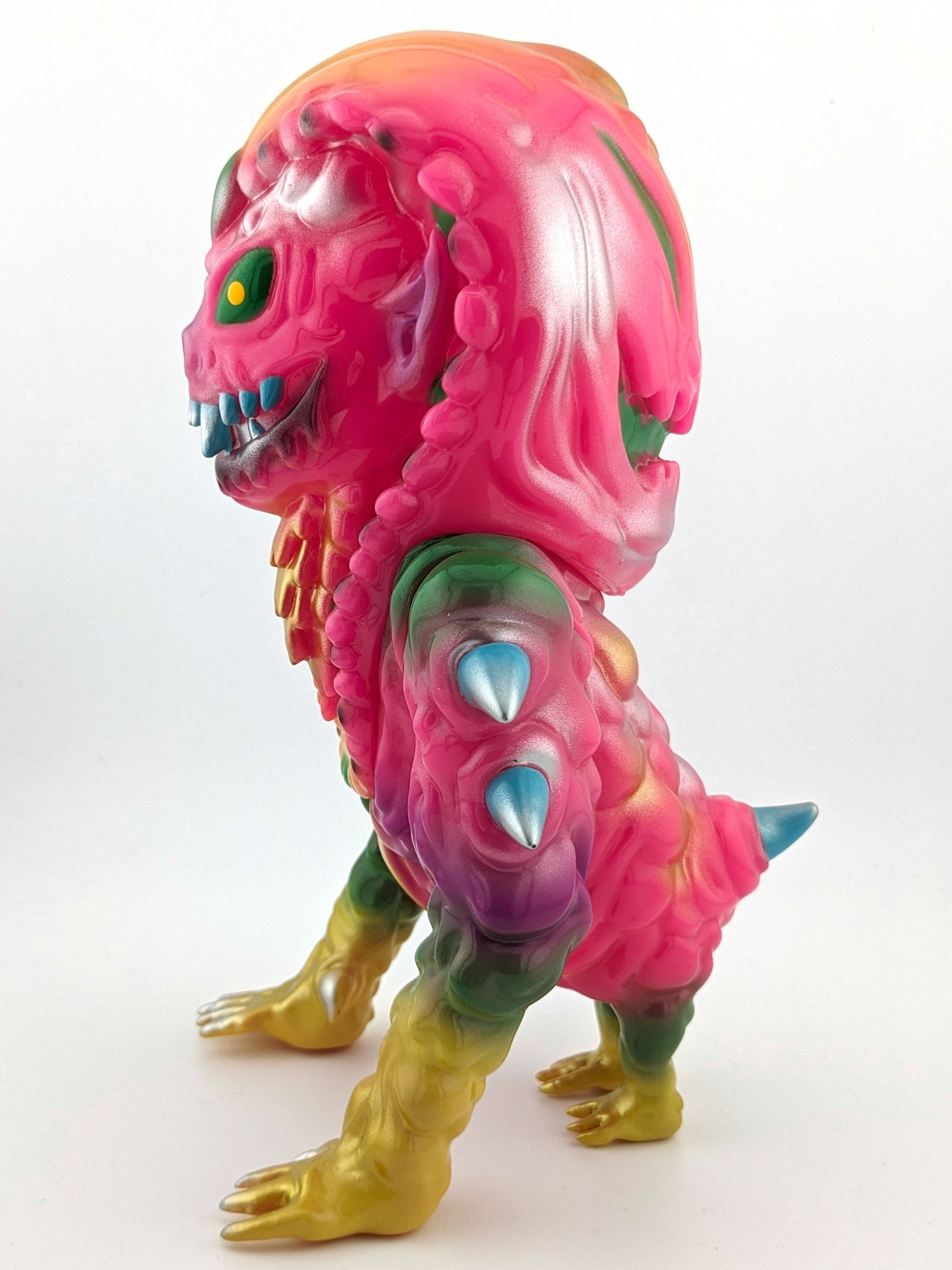 Pink vinyl with yellow, green, gold, silver, and light blue paint