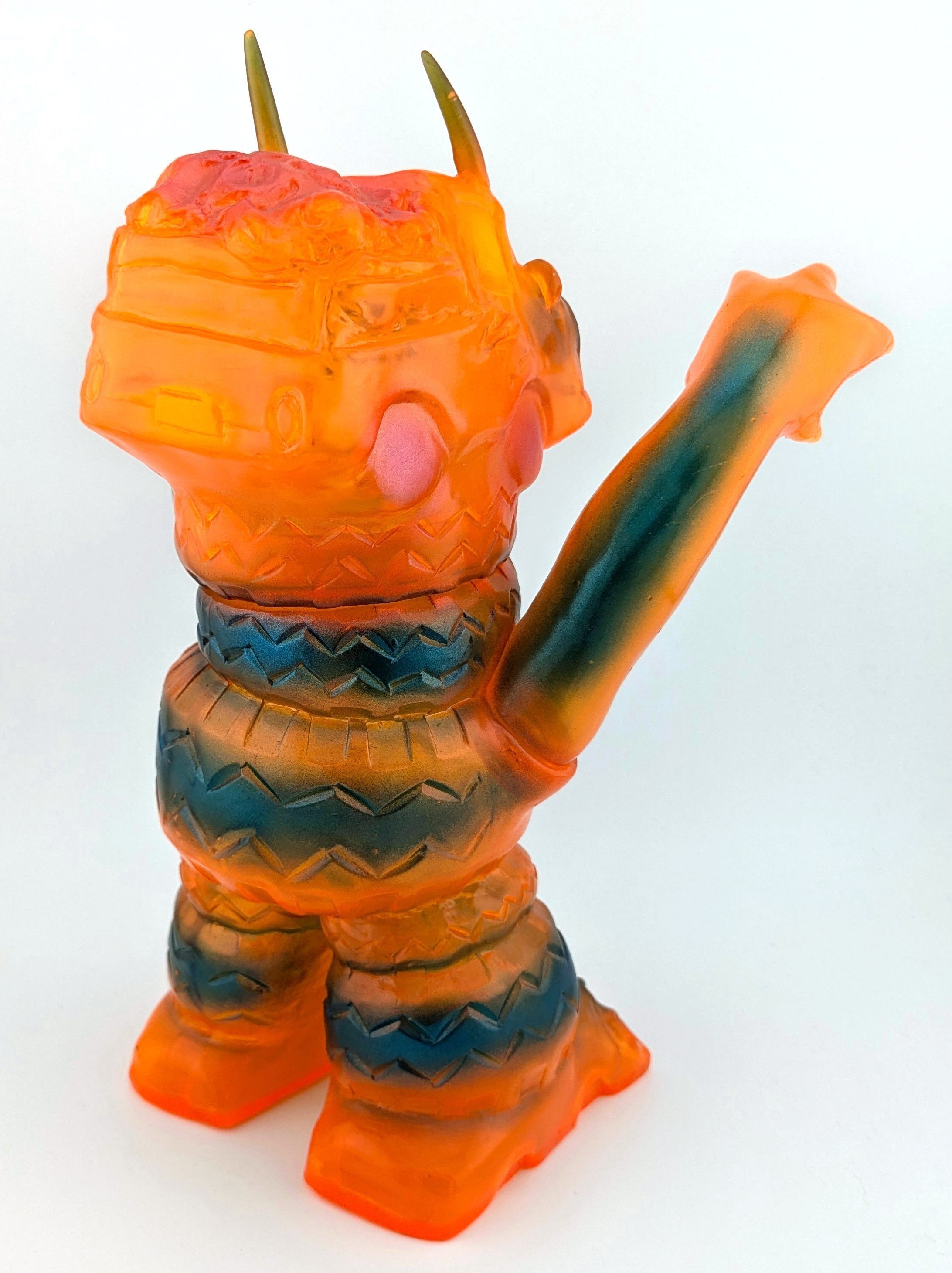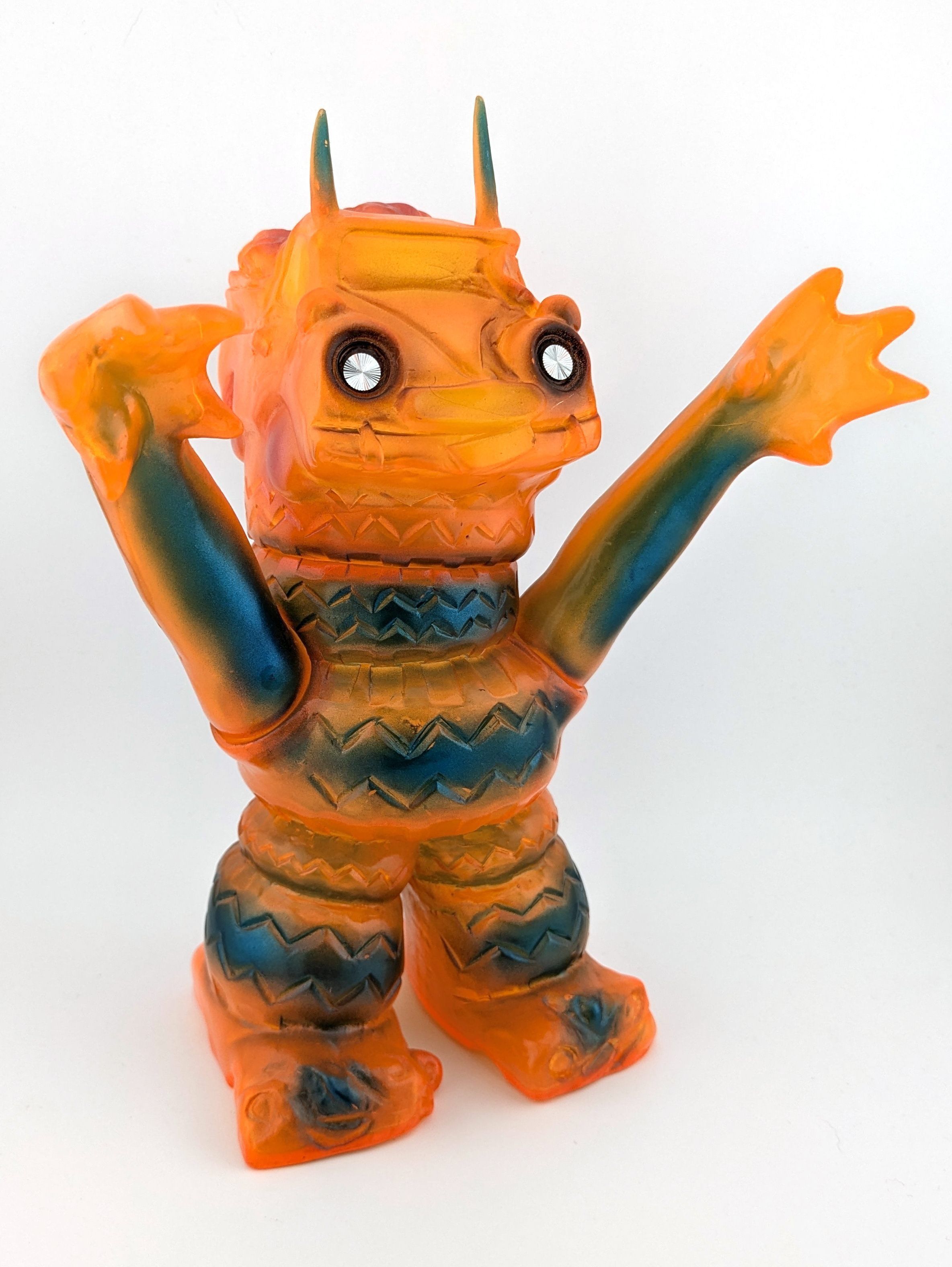 Trans orange vinyl with black, blue, and pink paint; with silver metal disc eyes