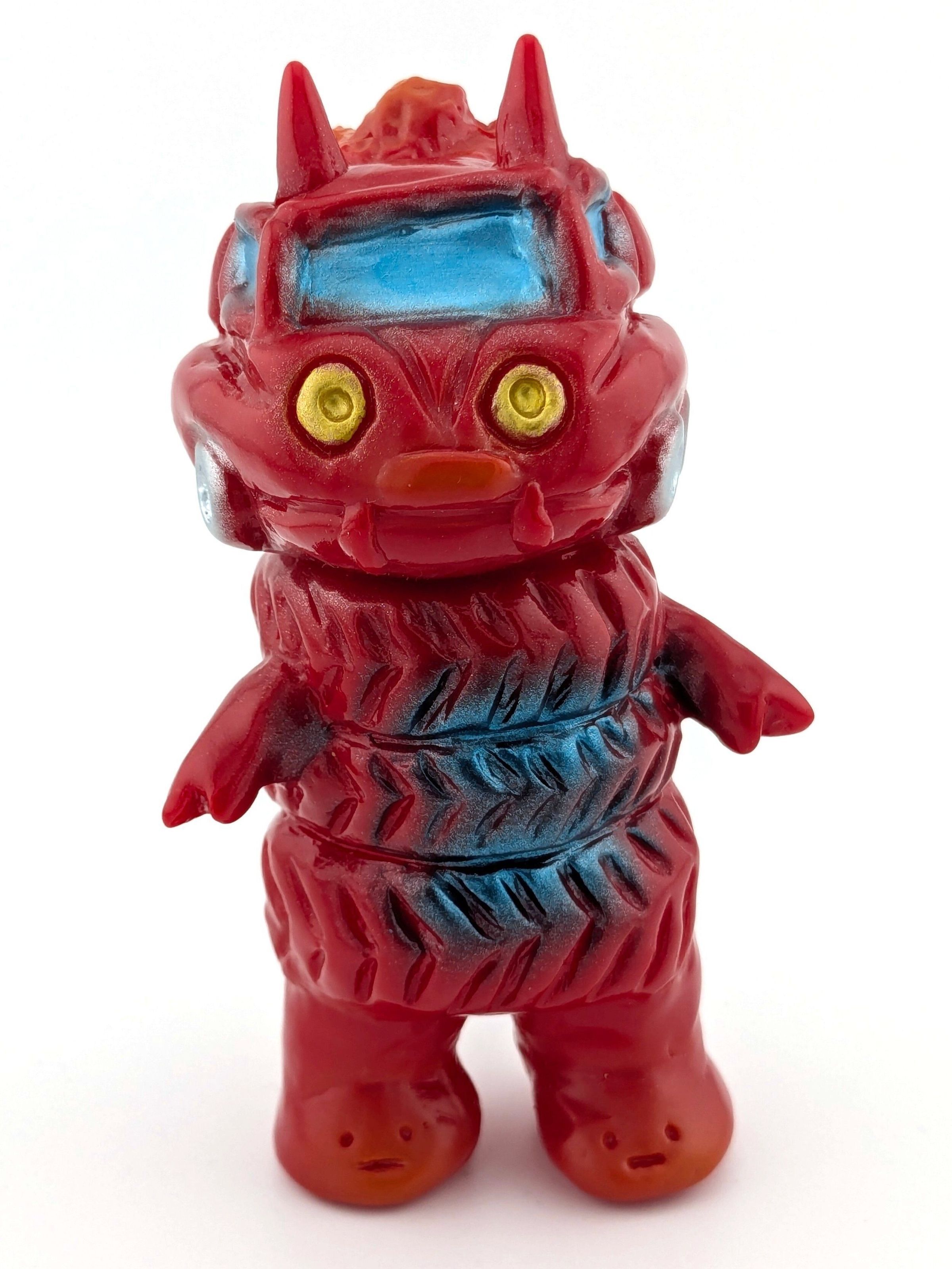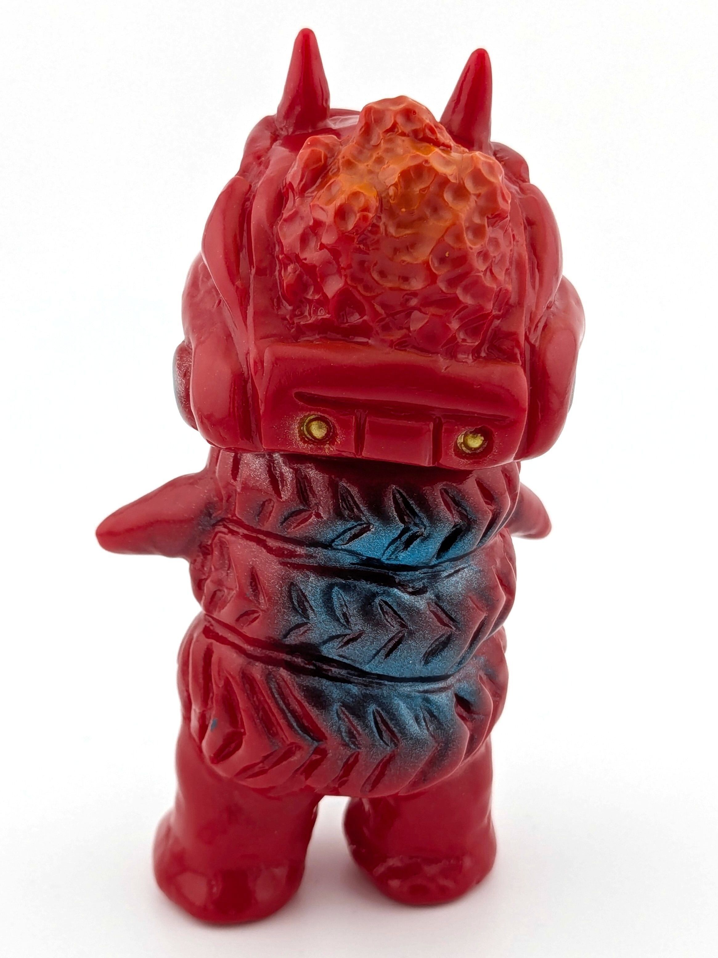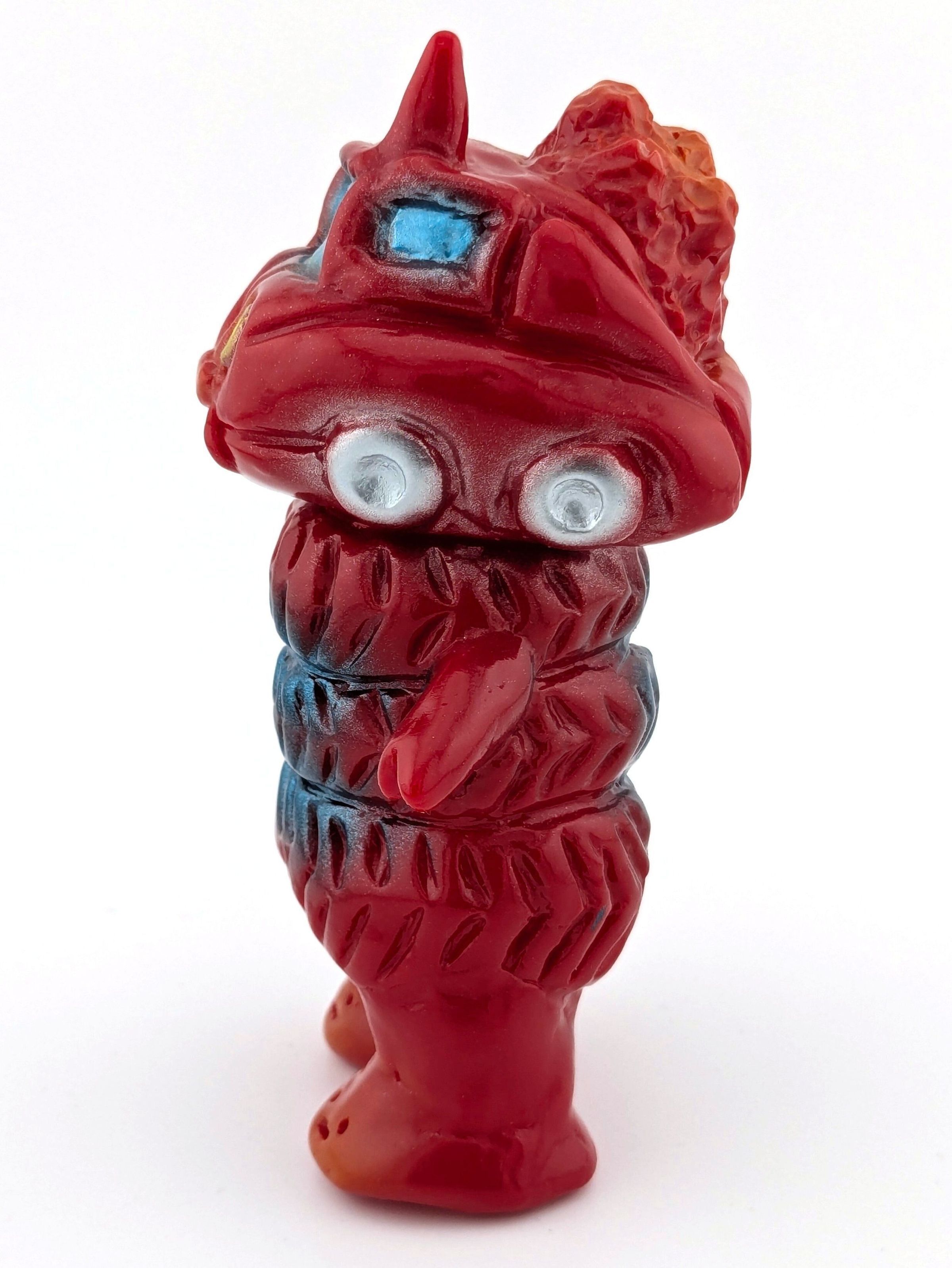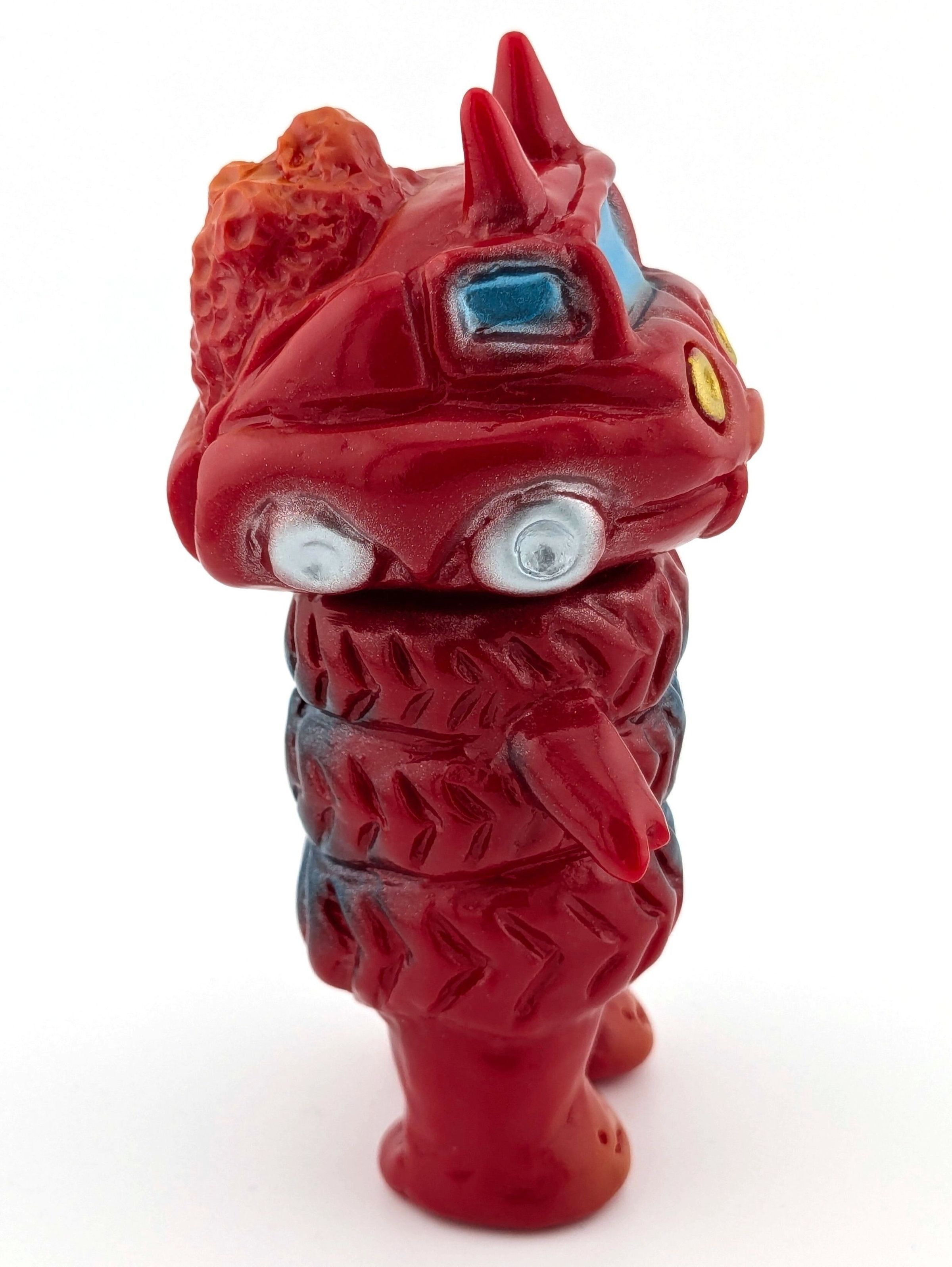 Red vinyl with blue, silver, gold, and orange paint.