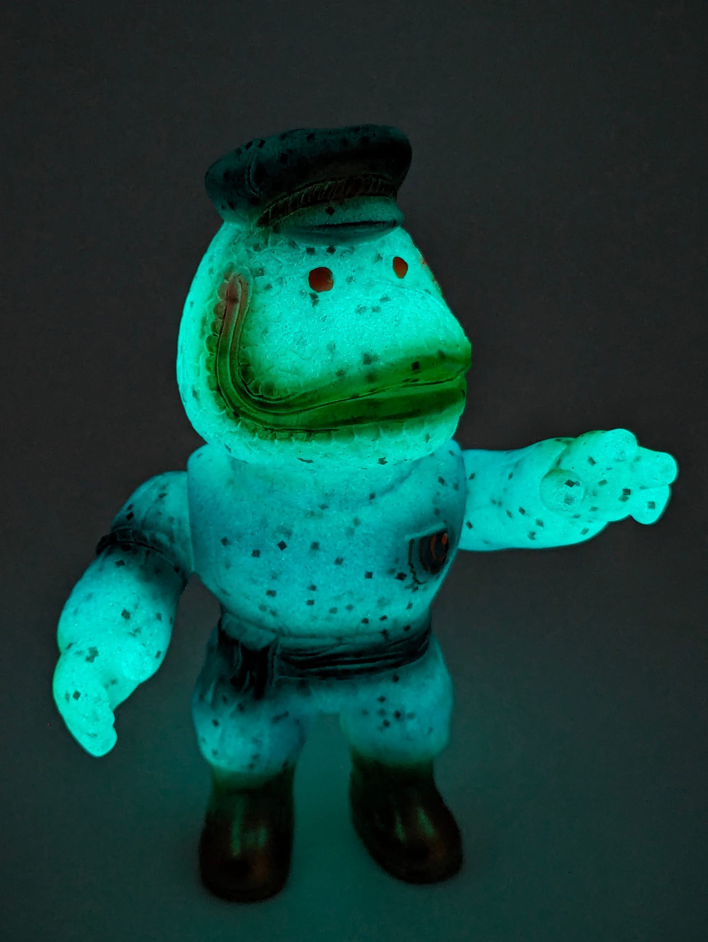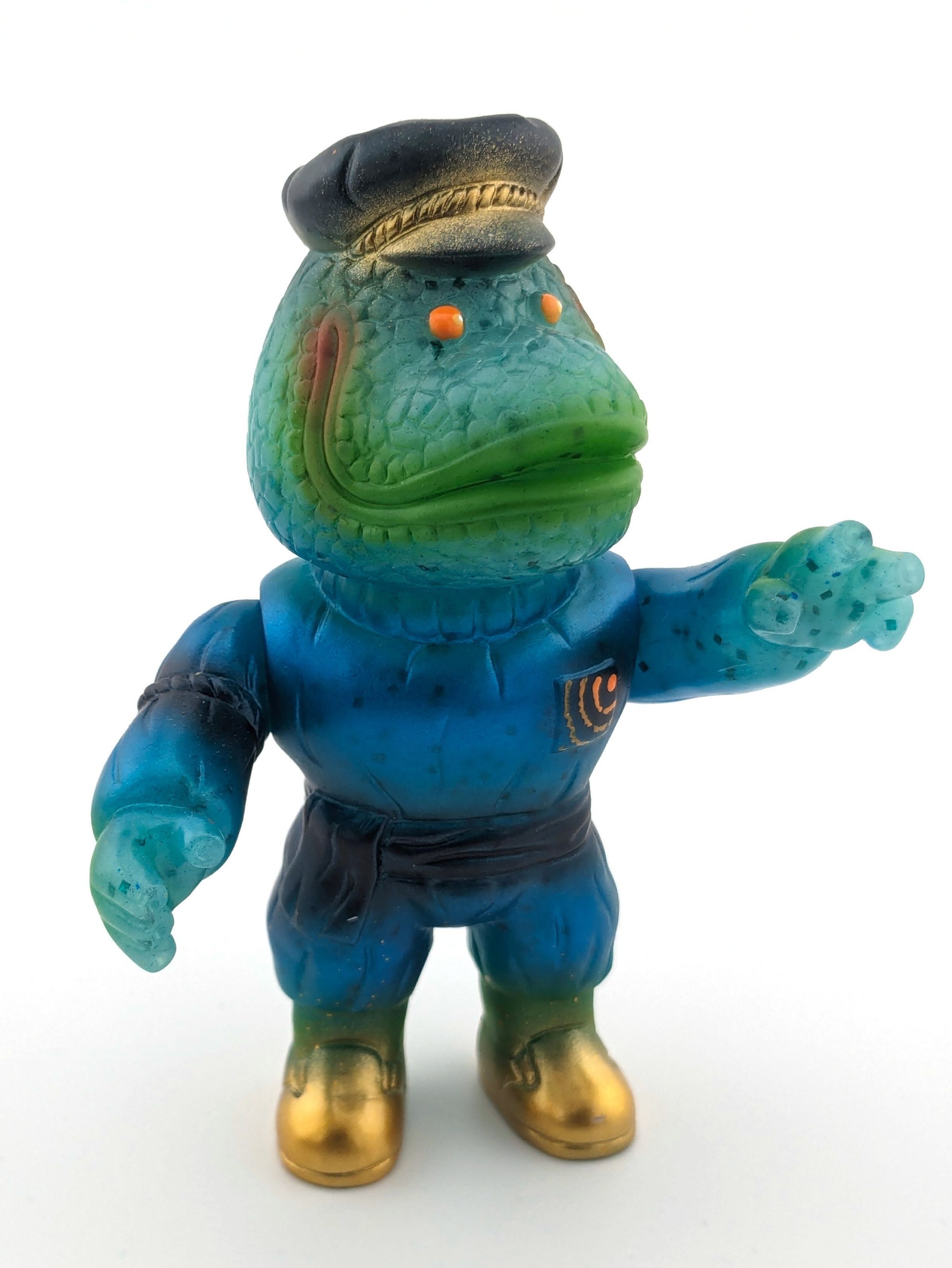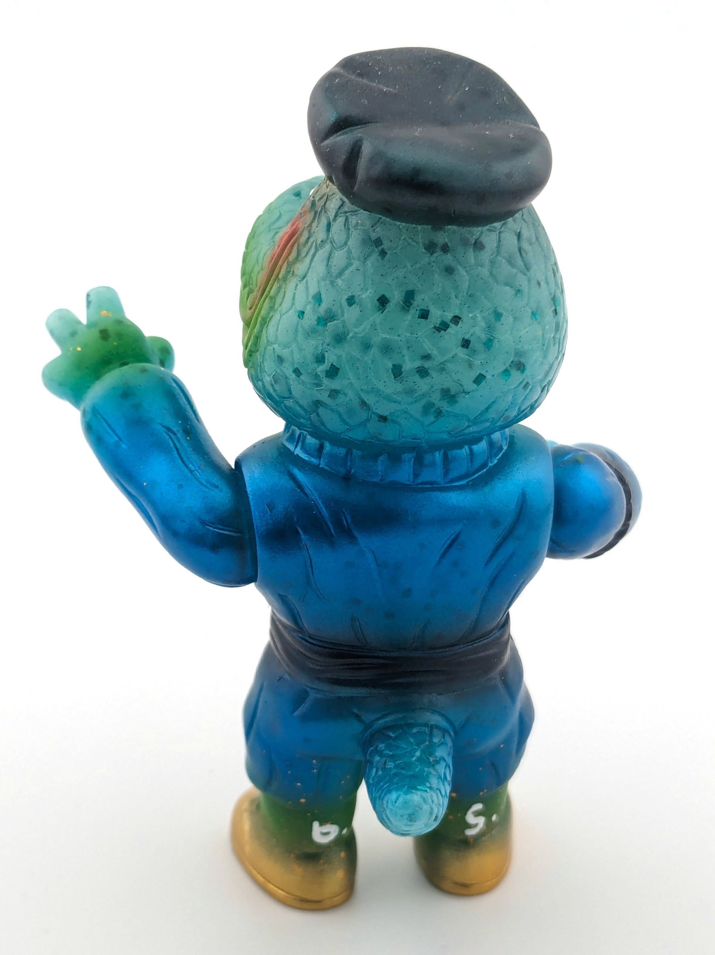 Blue GID lame vinyl with black, gold, metallic blue, and fluro orange paint