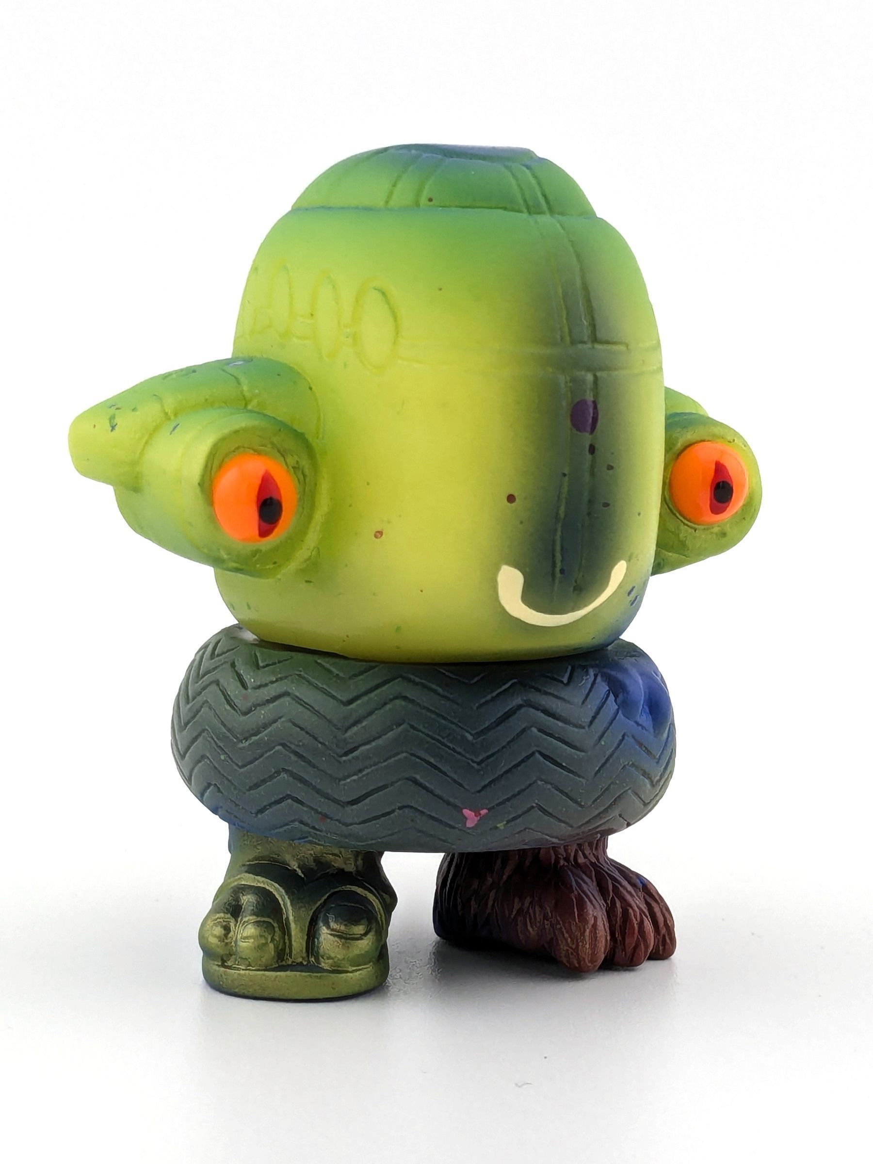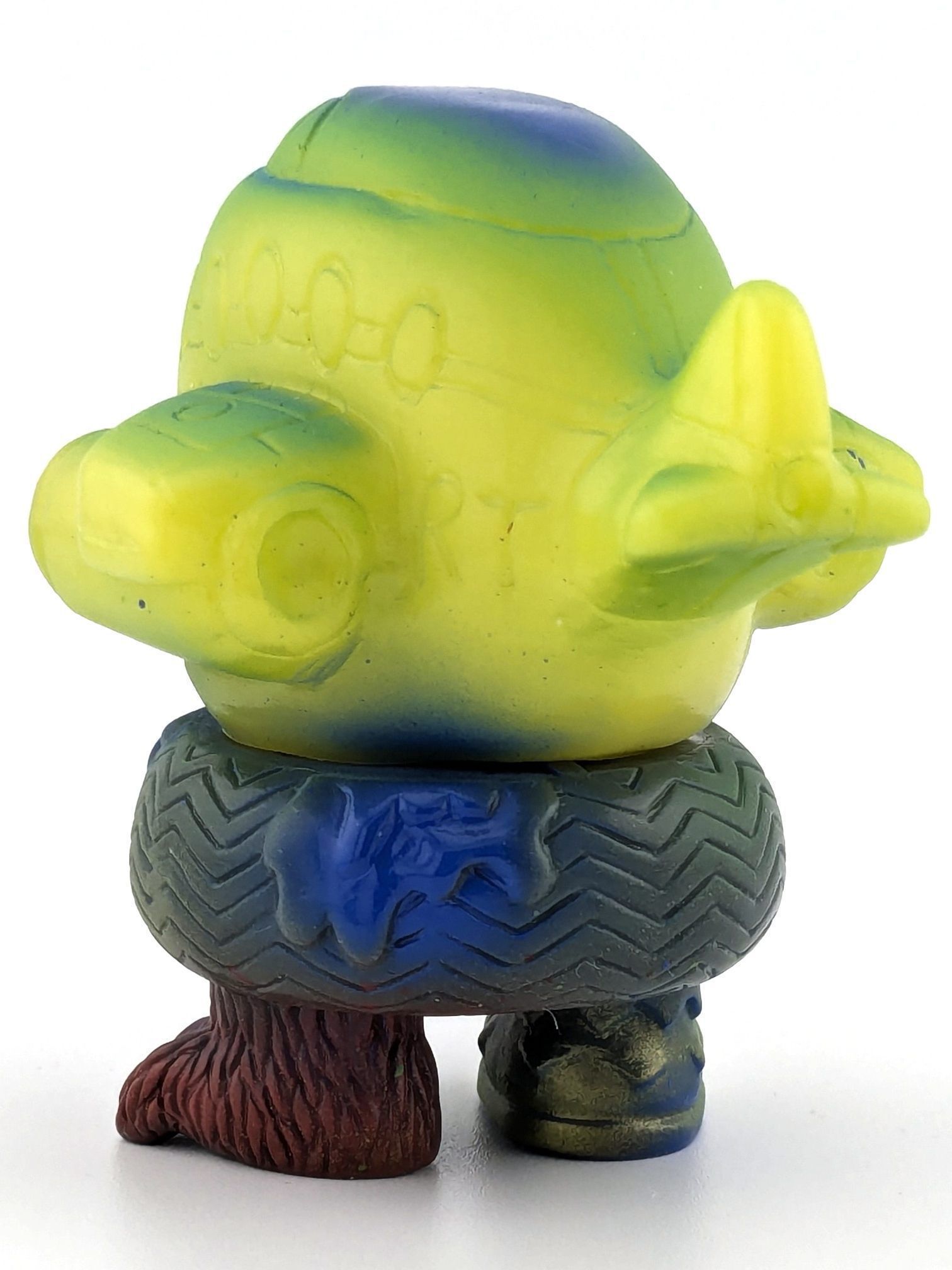Blue and lime green vinyl with blue, green, red, fluro orange, black, and white paint