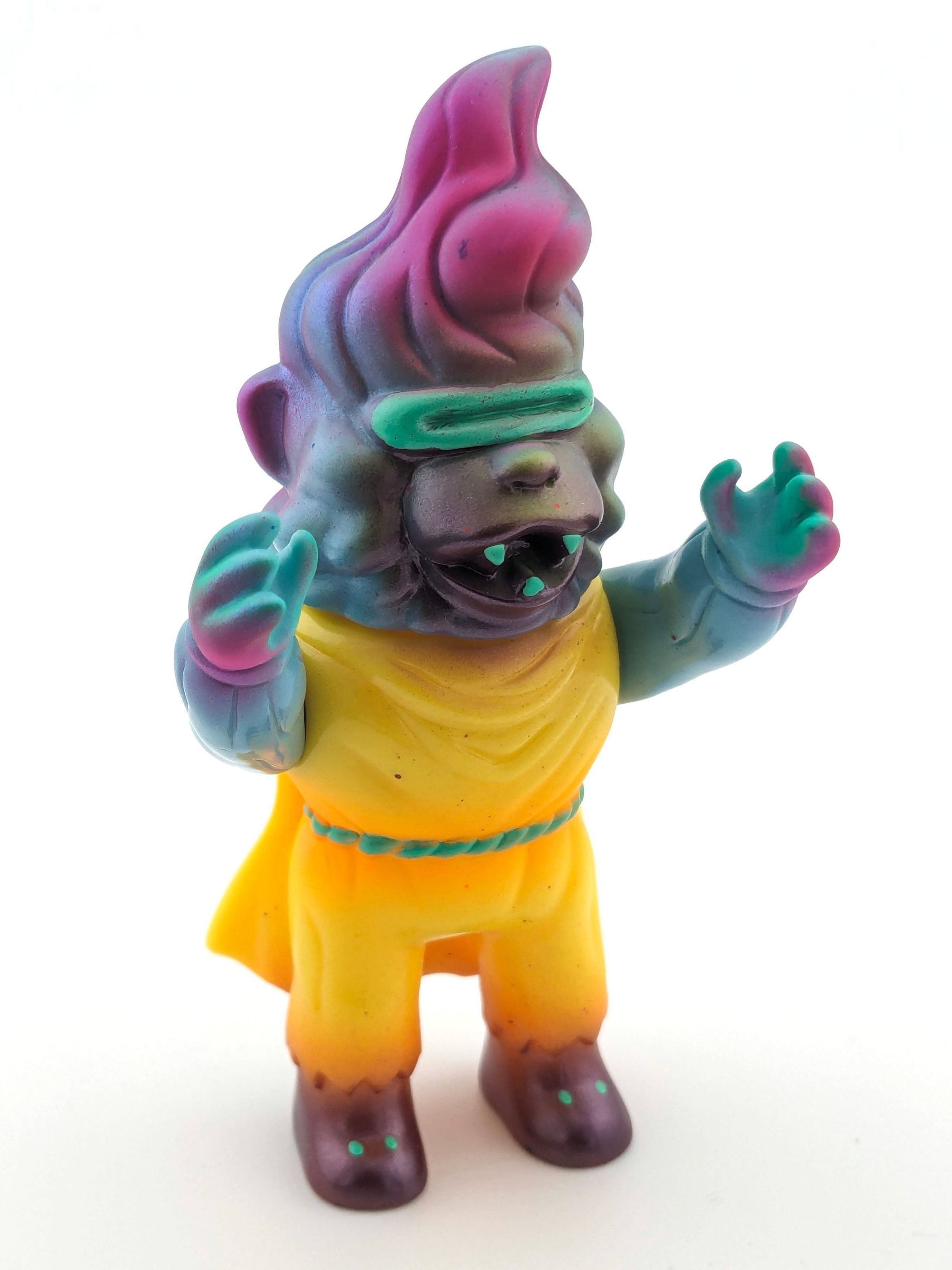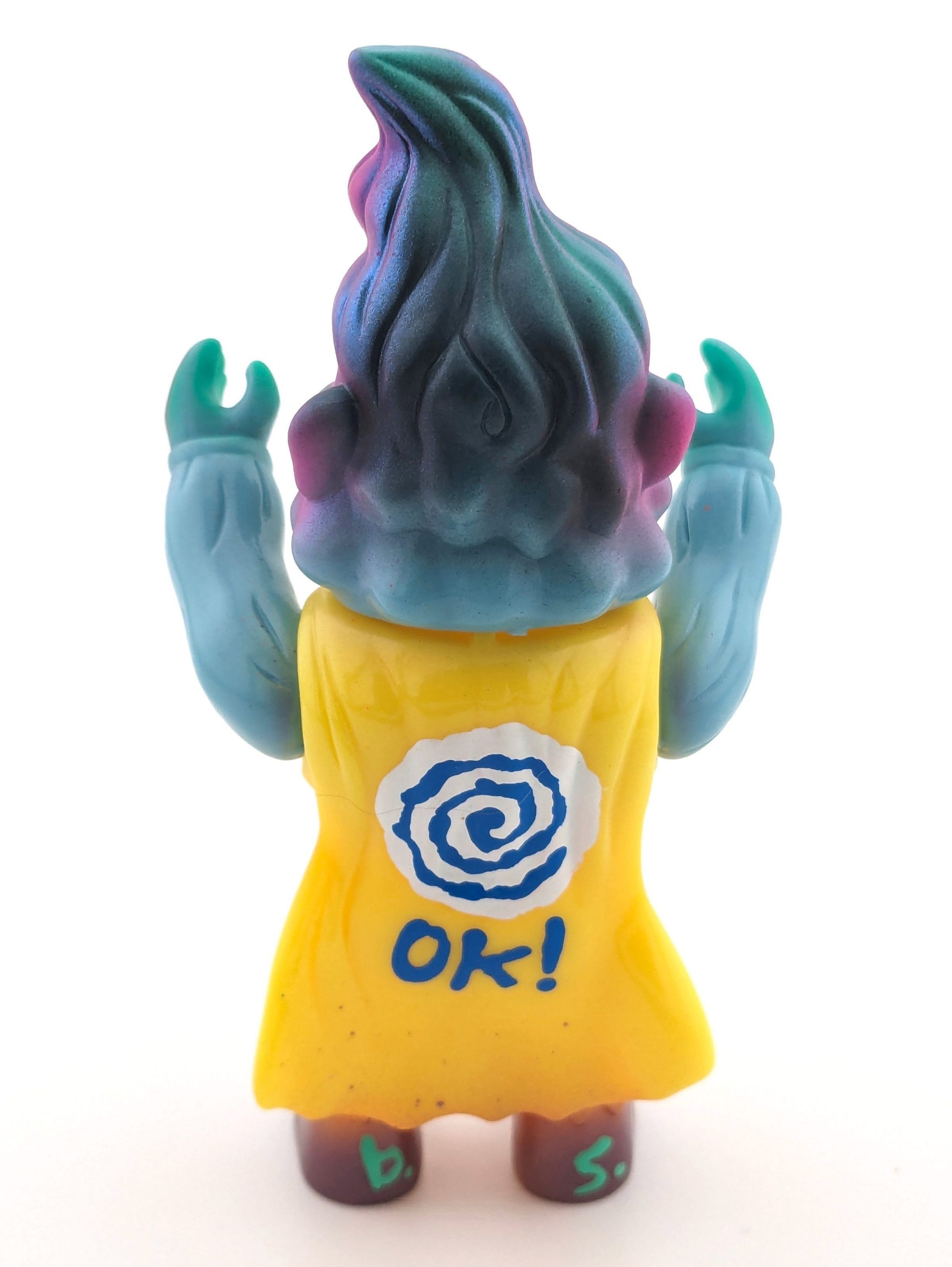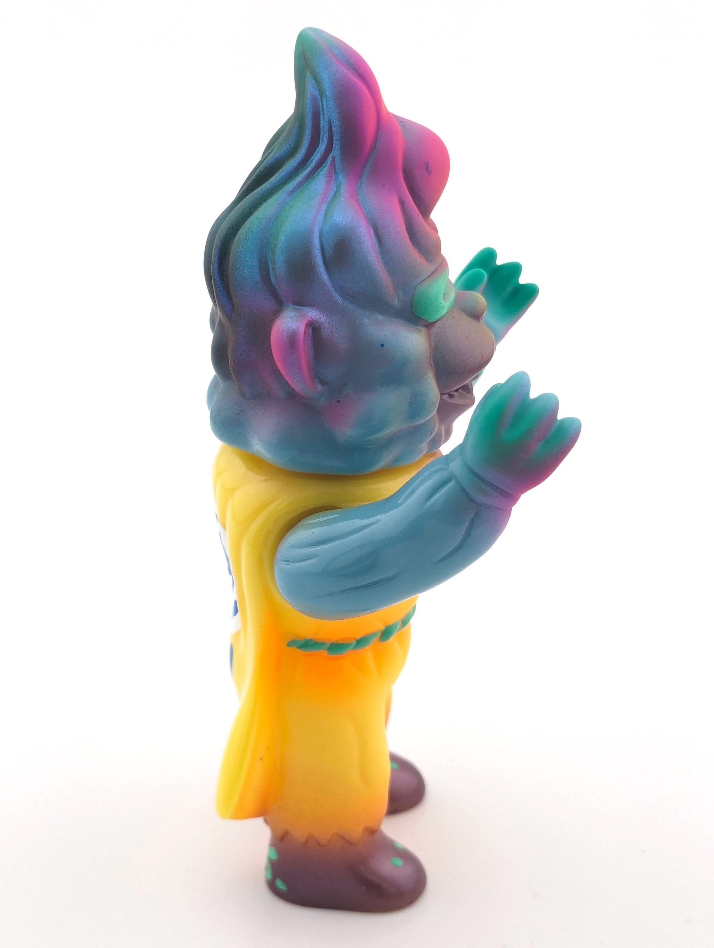 Yellow and blue vinyl with pink, black, turquoise, white, and metallic red paint