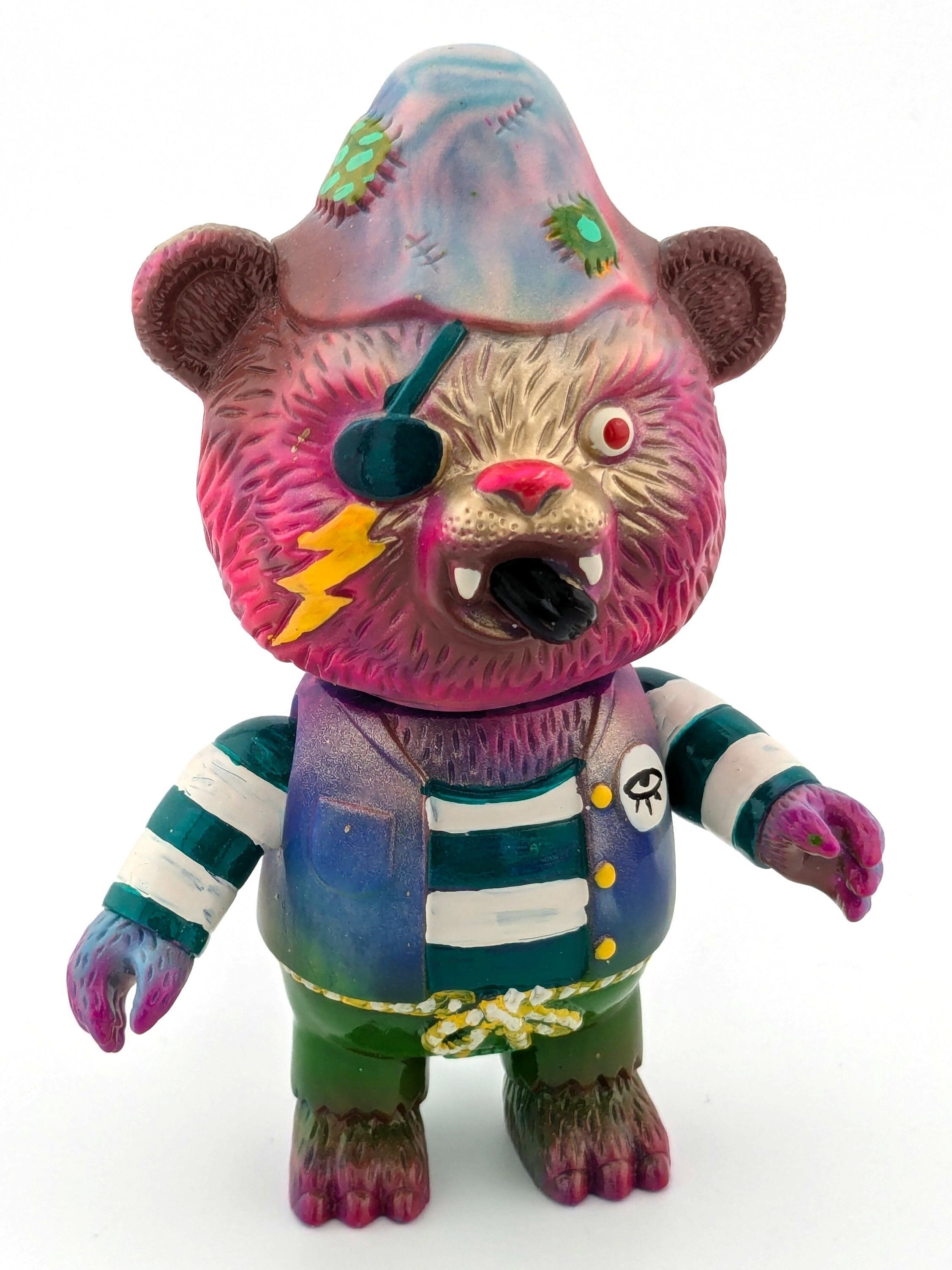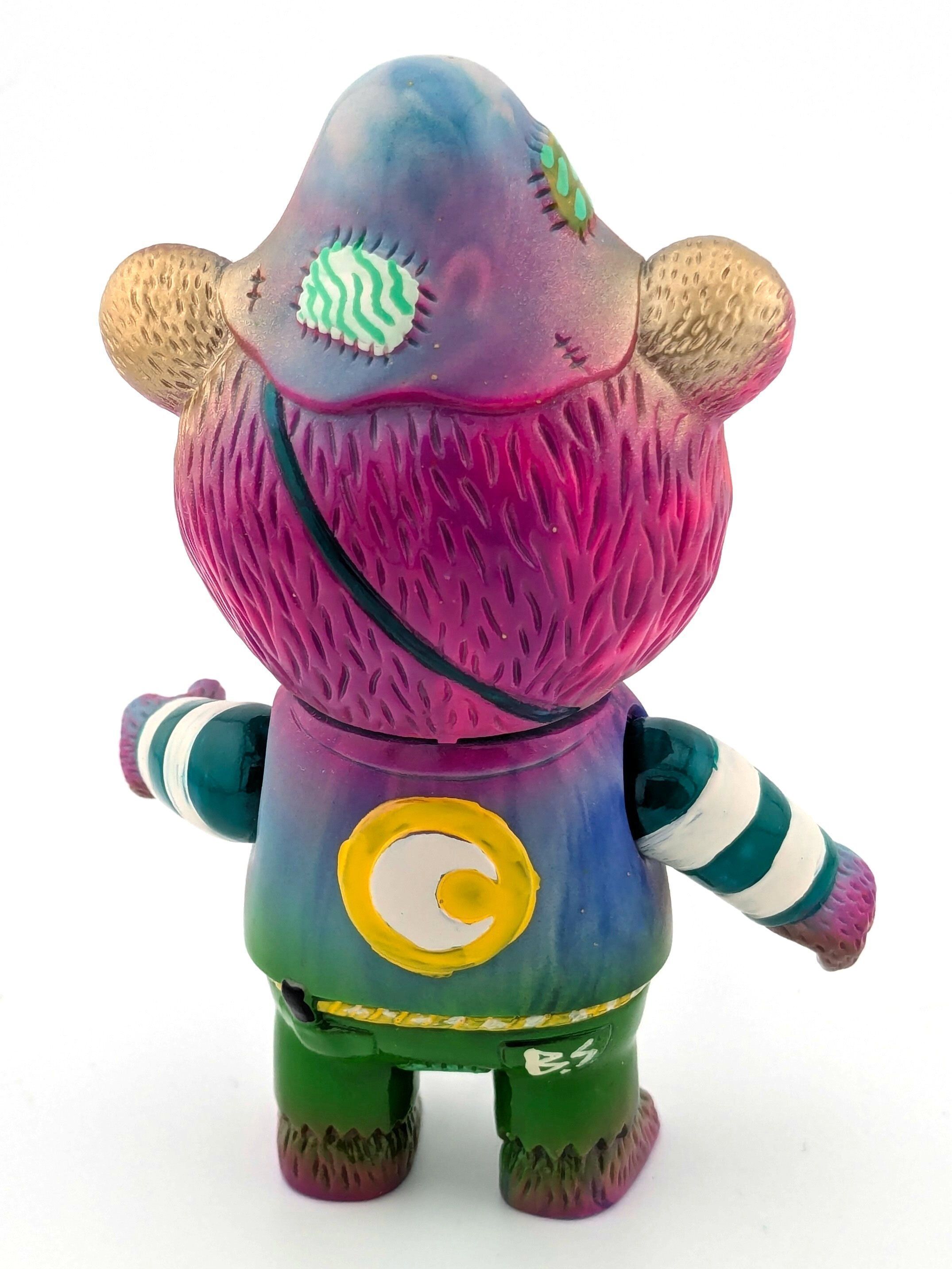Pink and blue marbled vinyl with magenta, gold, green, white, and yellow paint