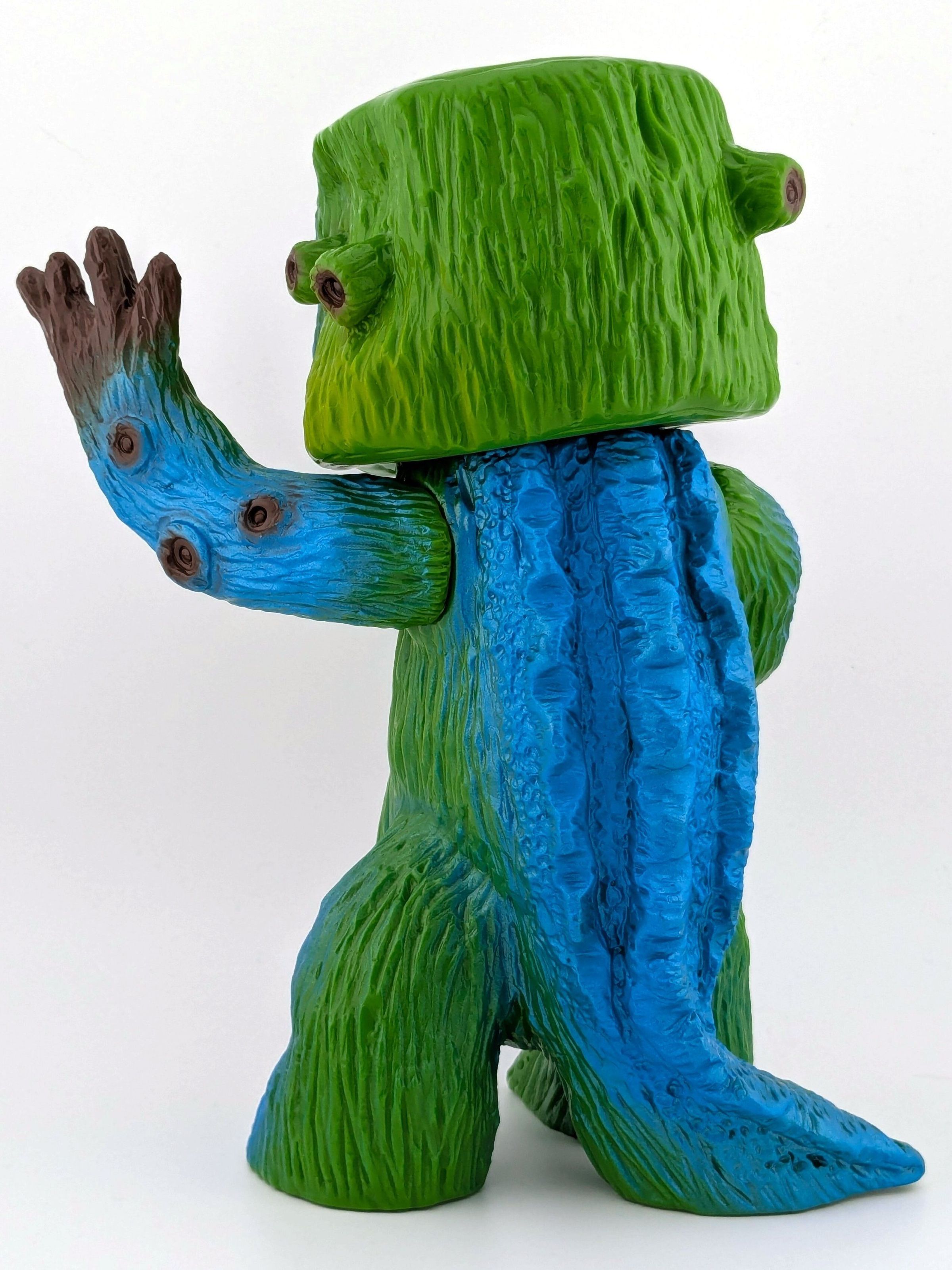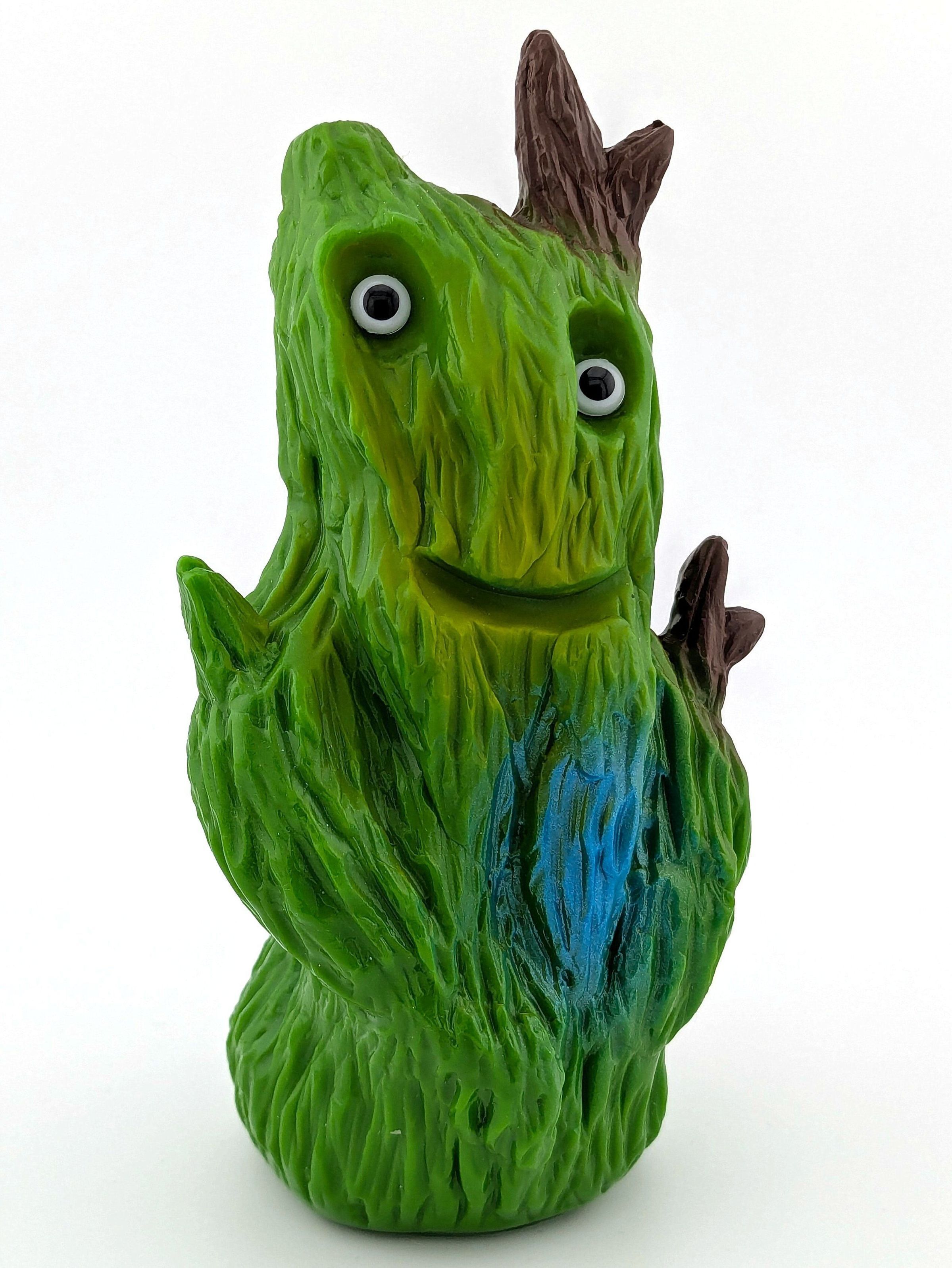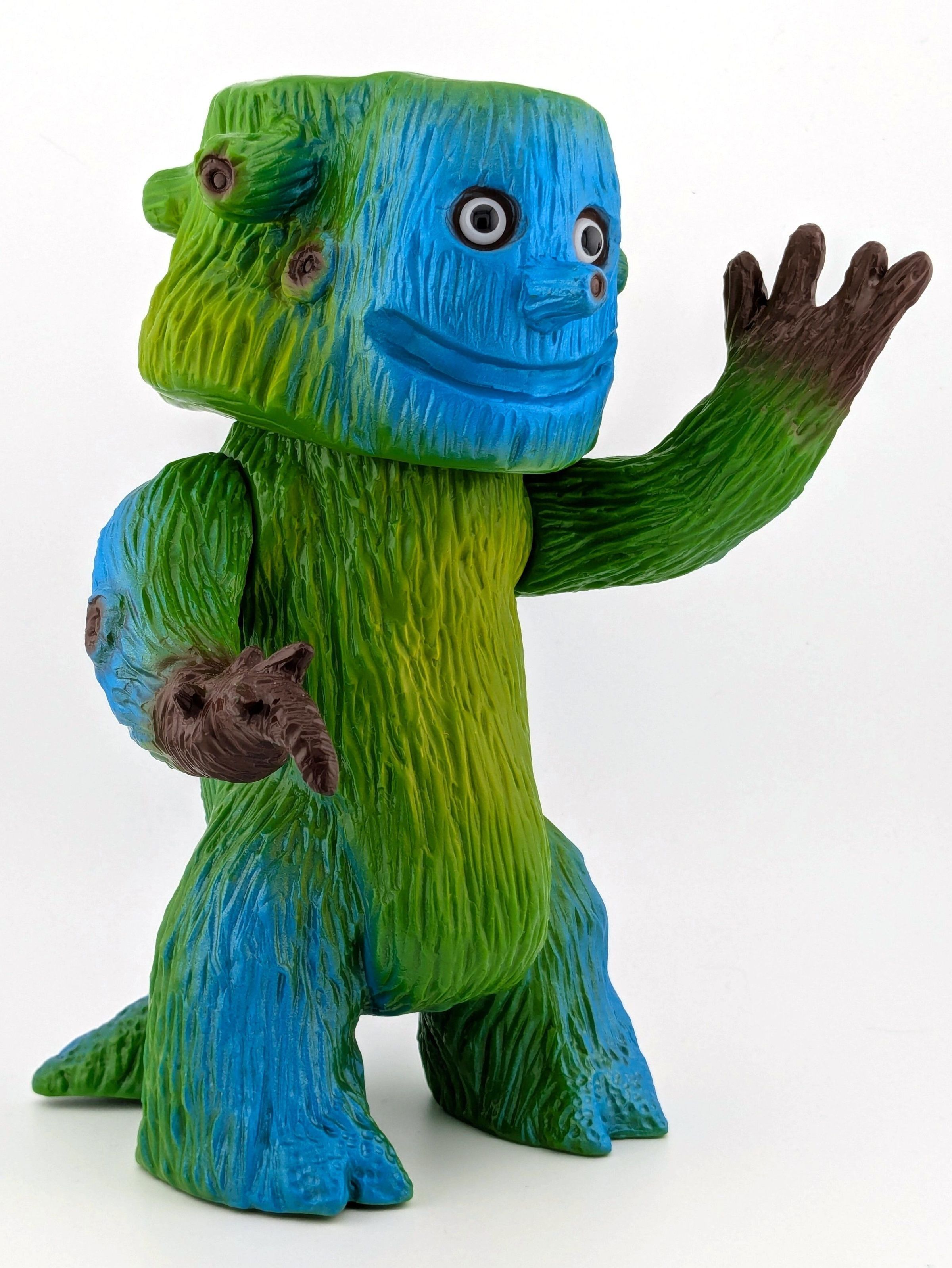 Green vinyl with blue, brown, and light green paint. With doll eyes.