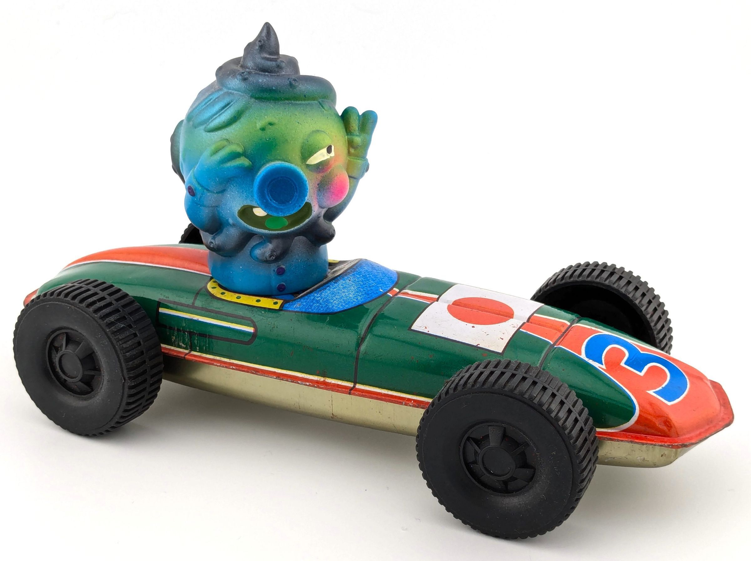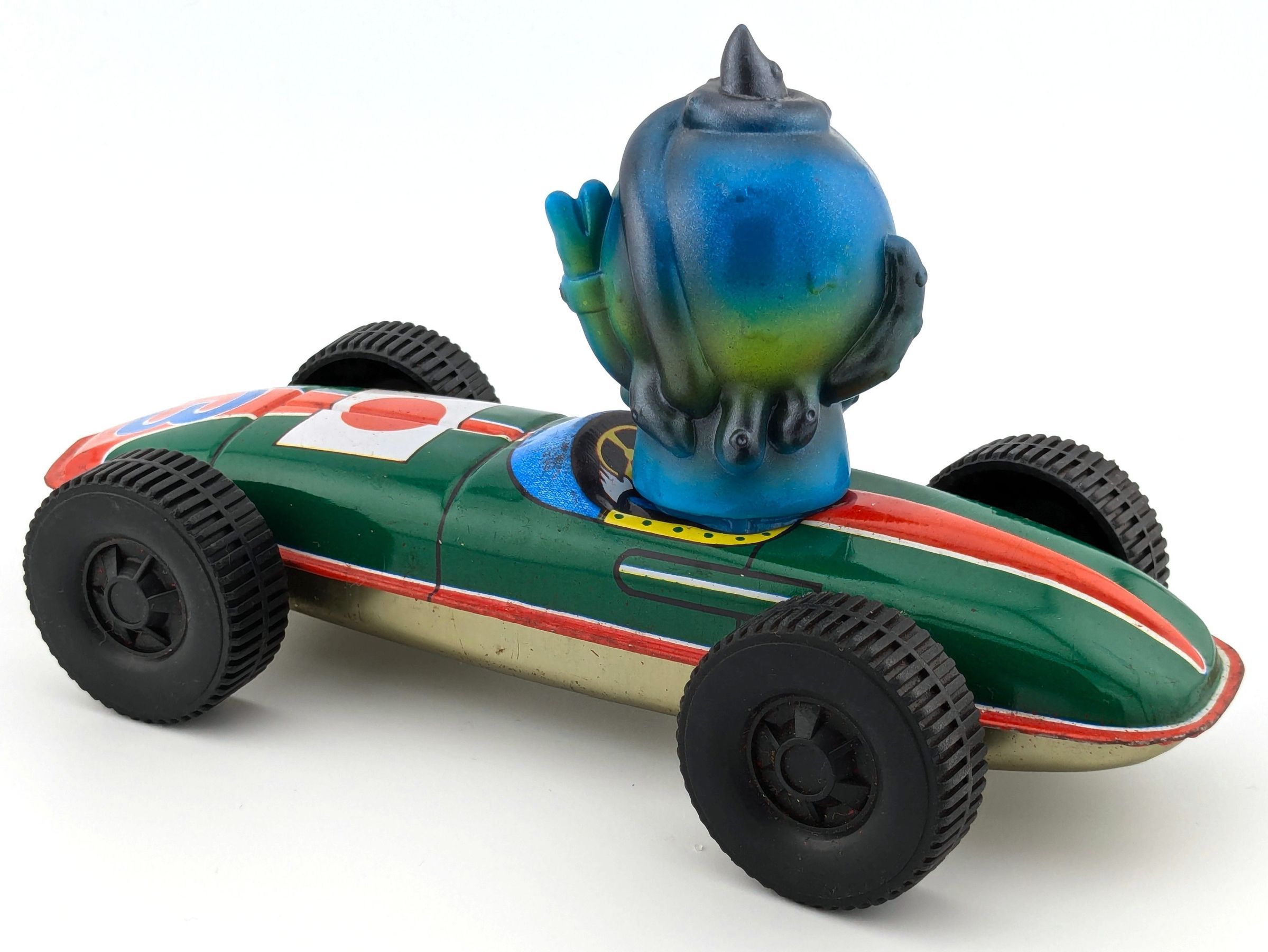 Blue vinyl with black, green, silver, and pink paint; vintage Japanese litho tin toy racer