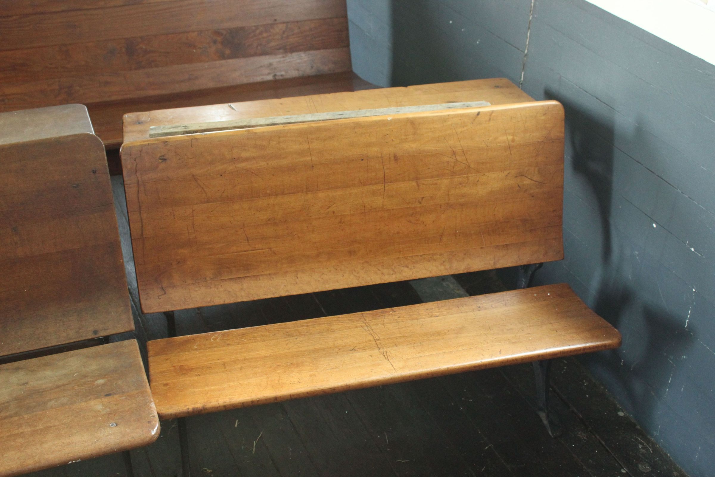 small desk for two students, seat and table, inkwell and pencil divotCataloged By