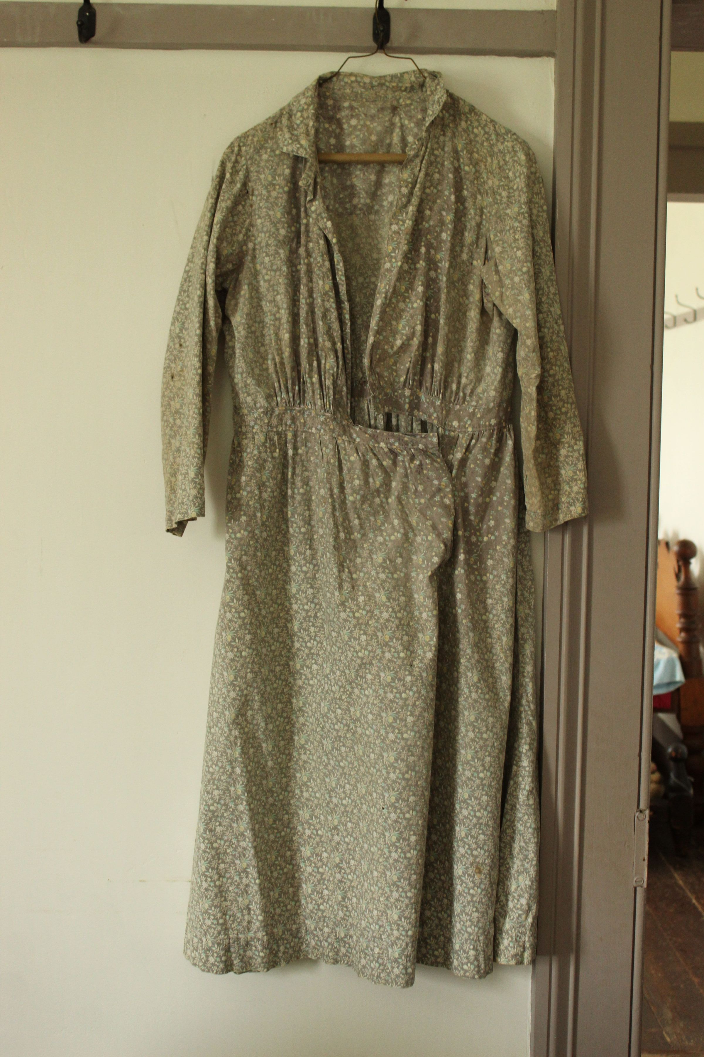 Gray shin-length dress held together with pinsCataloged By