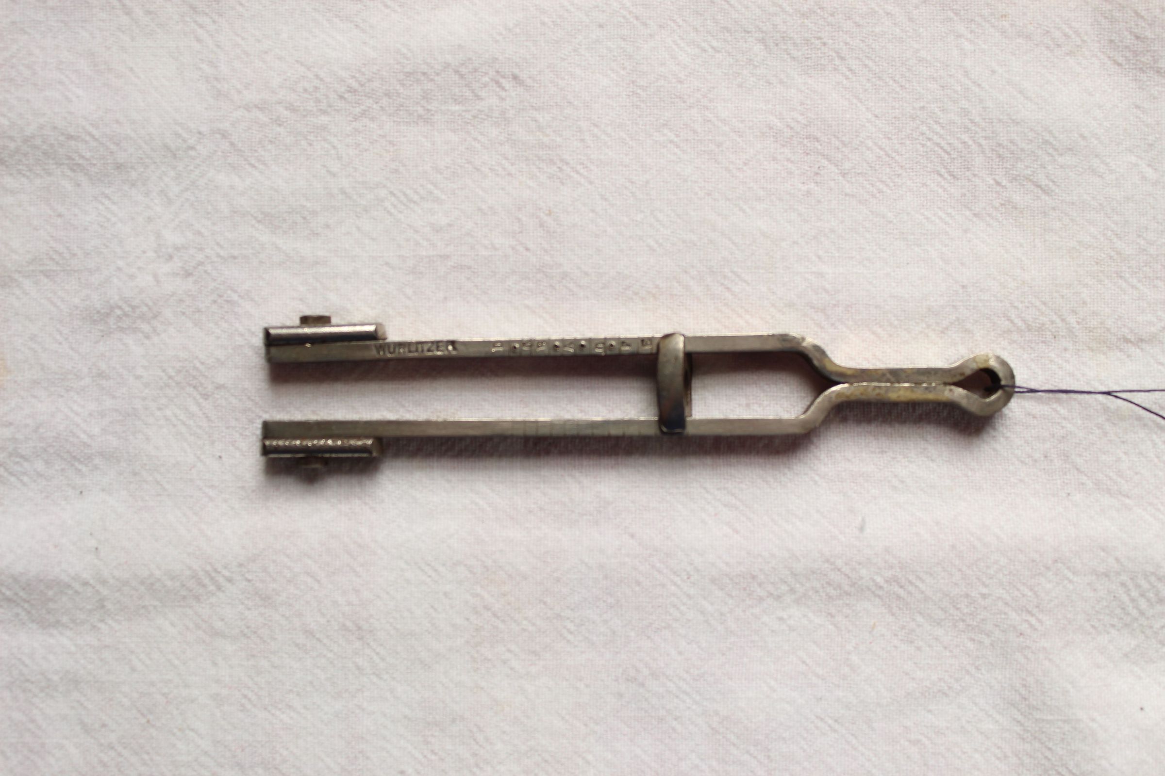 Adjustable tuning fork ranging from D to E. Used by Pete Shifflet at New Years Sing. Pete died in 1943.