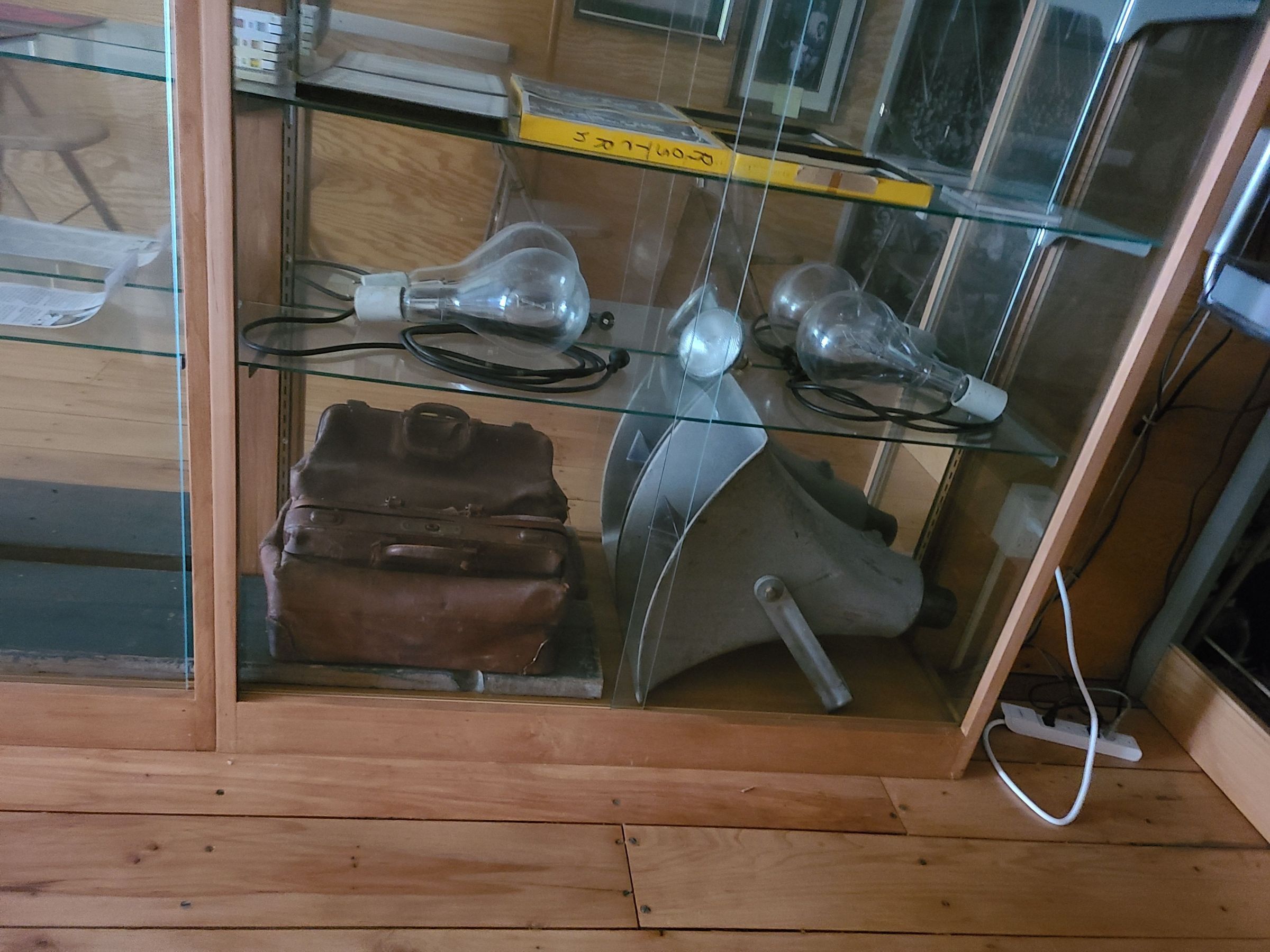 Varied lighting equipment and speaker in Display Case, microphone by podium