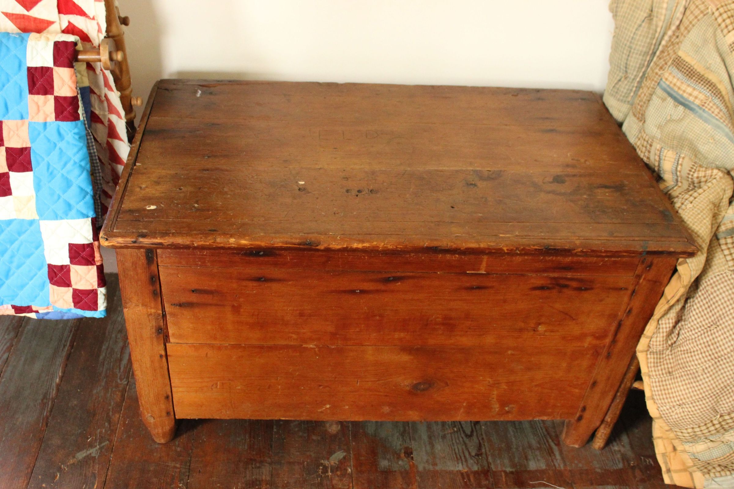 Wooden storage chest with E.L.D. carved on the outside of the lid. Several other initials are written in pencil inside the lid.
