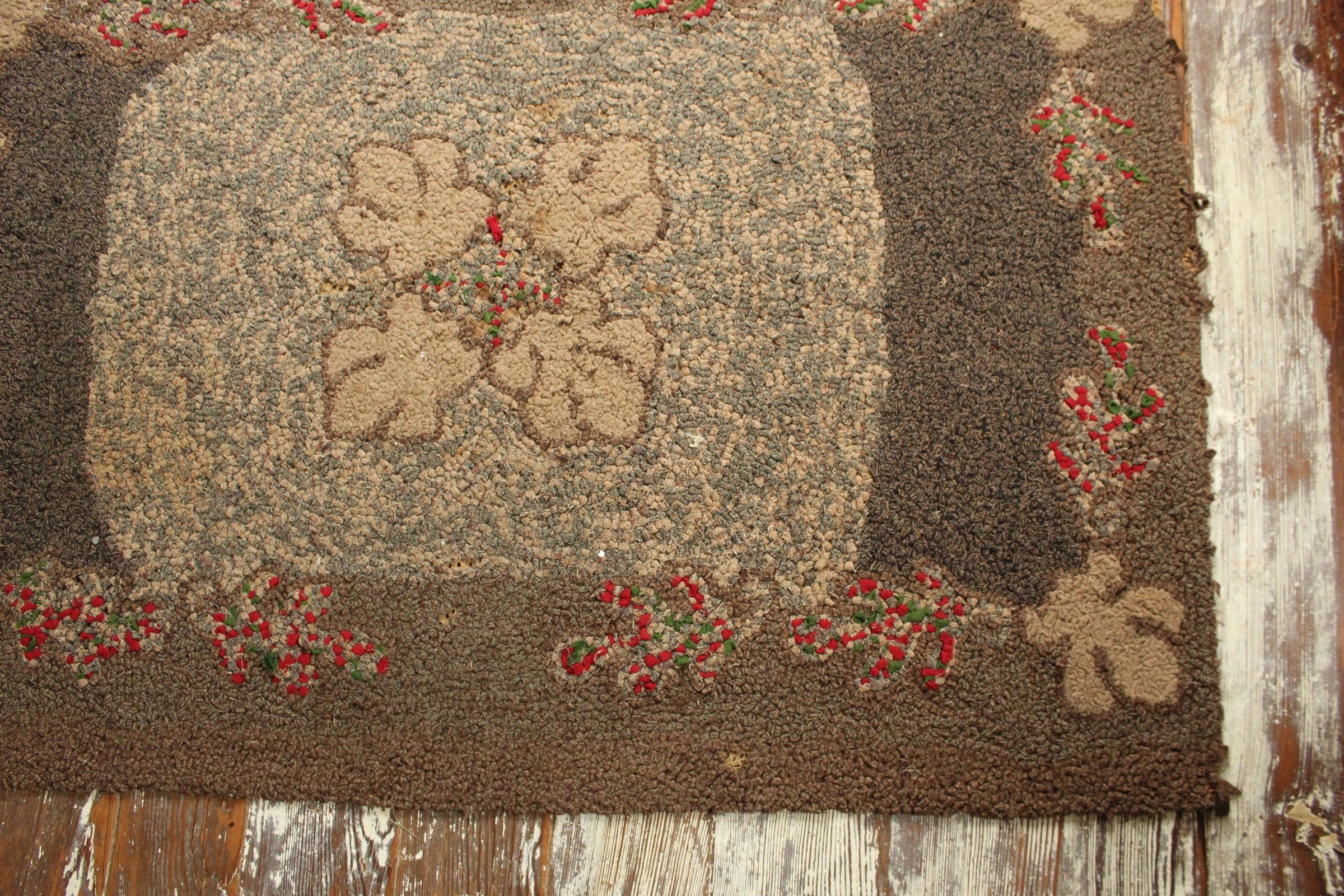 Brown hooked rug with red and green detailingTextile Type