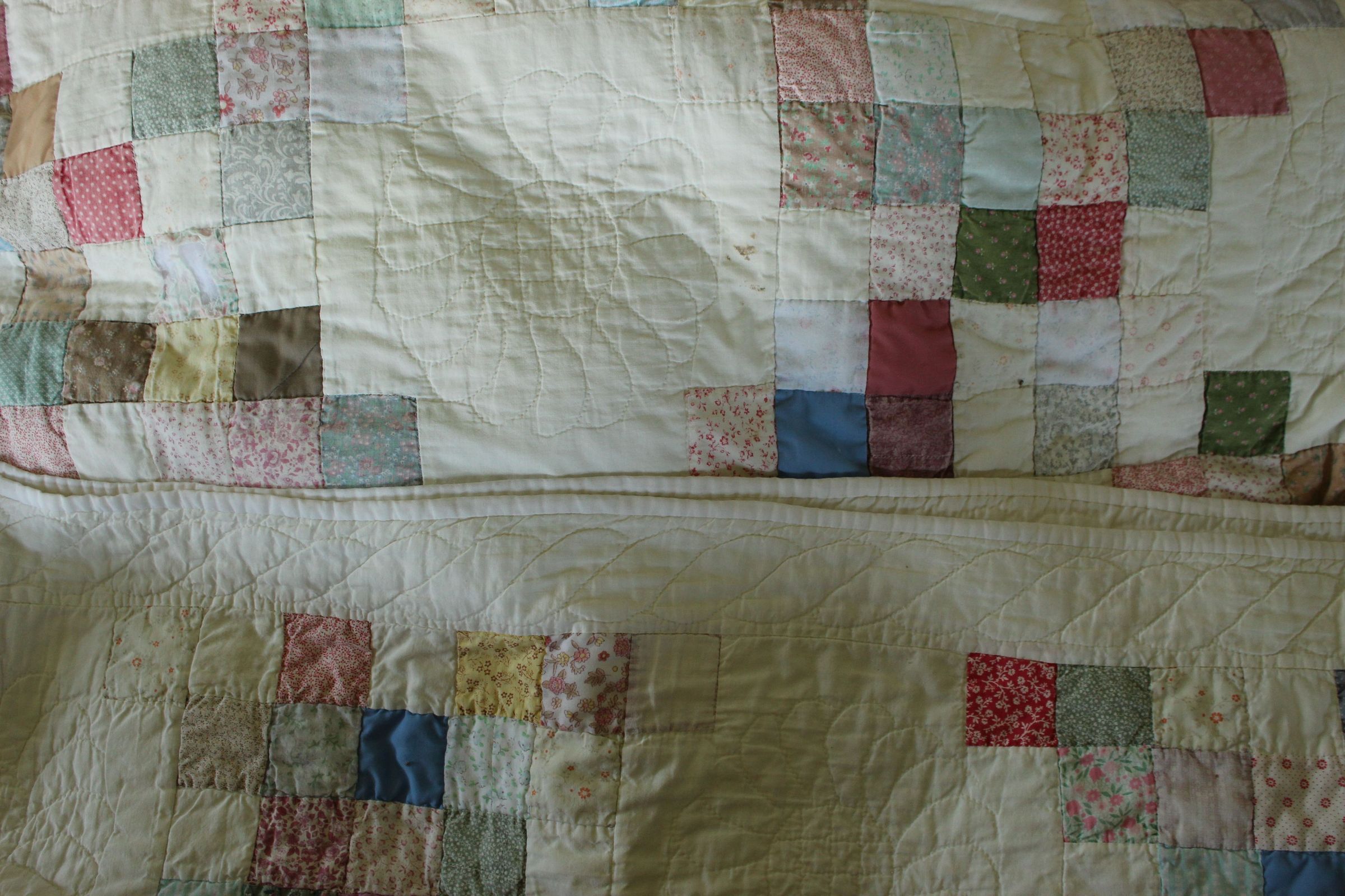 white quilt with light-colored squares and flower patterns