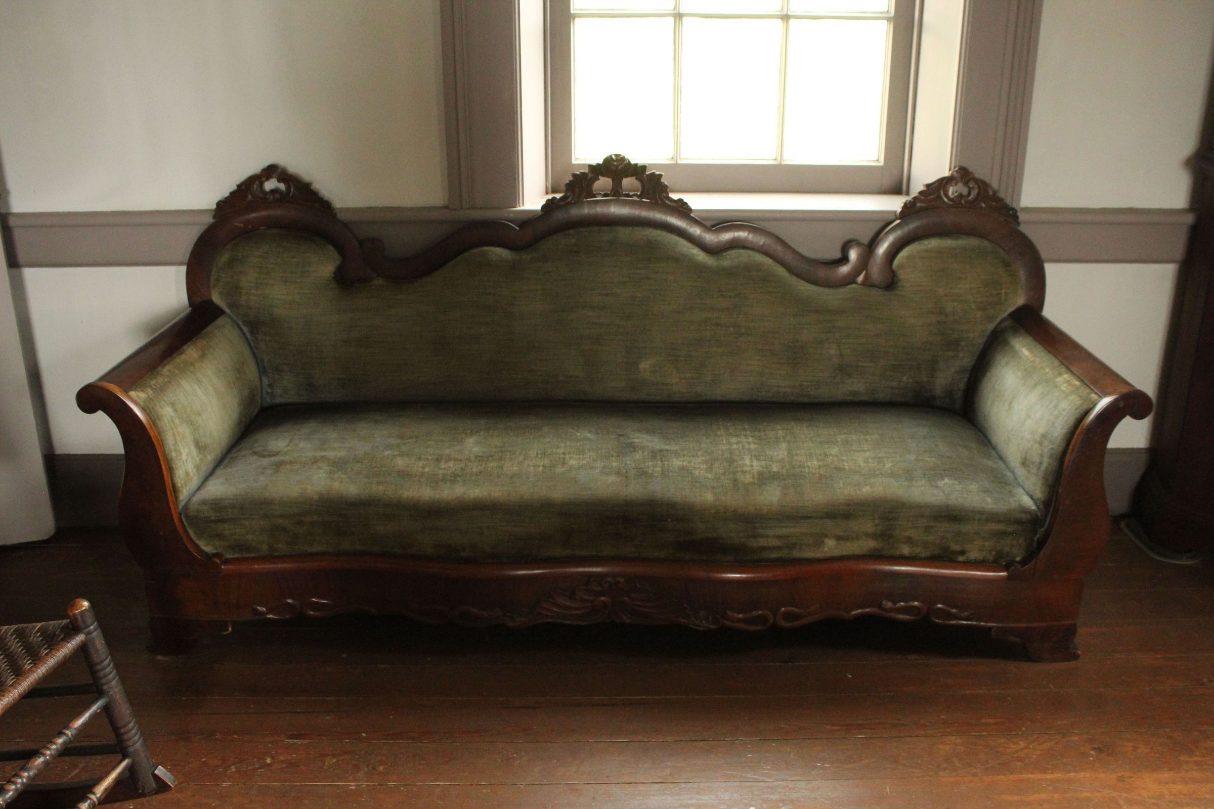 Wooden sofa with green cushions, scalloped edges at topCataloged By