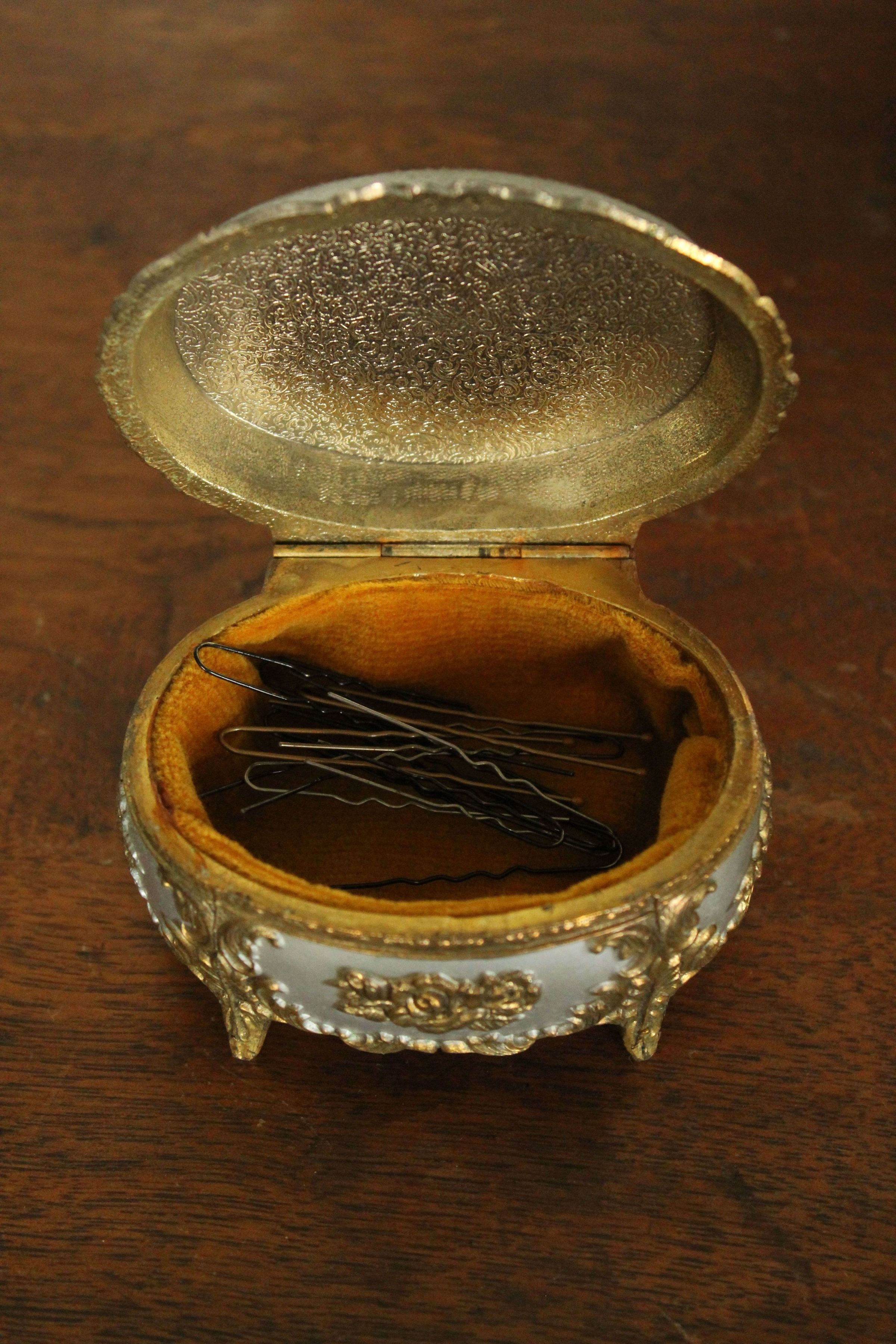 Silver and gold hairpin dish with flowered lid and pins