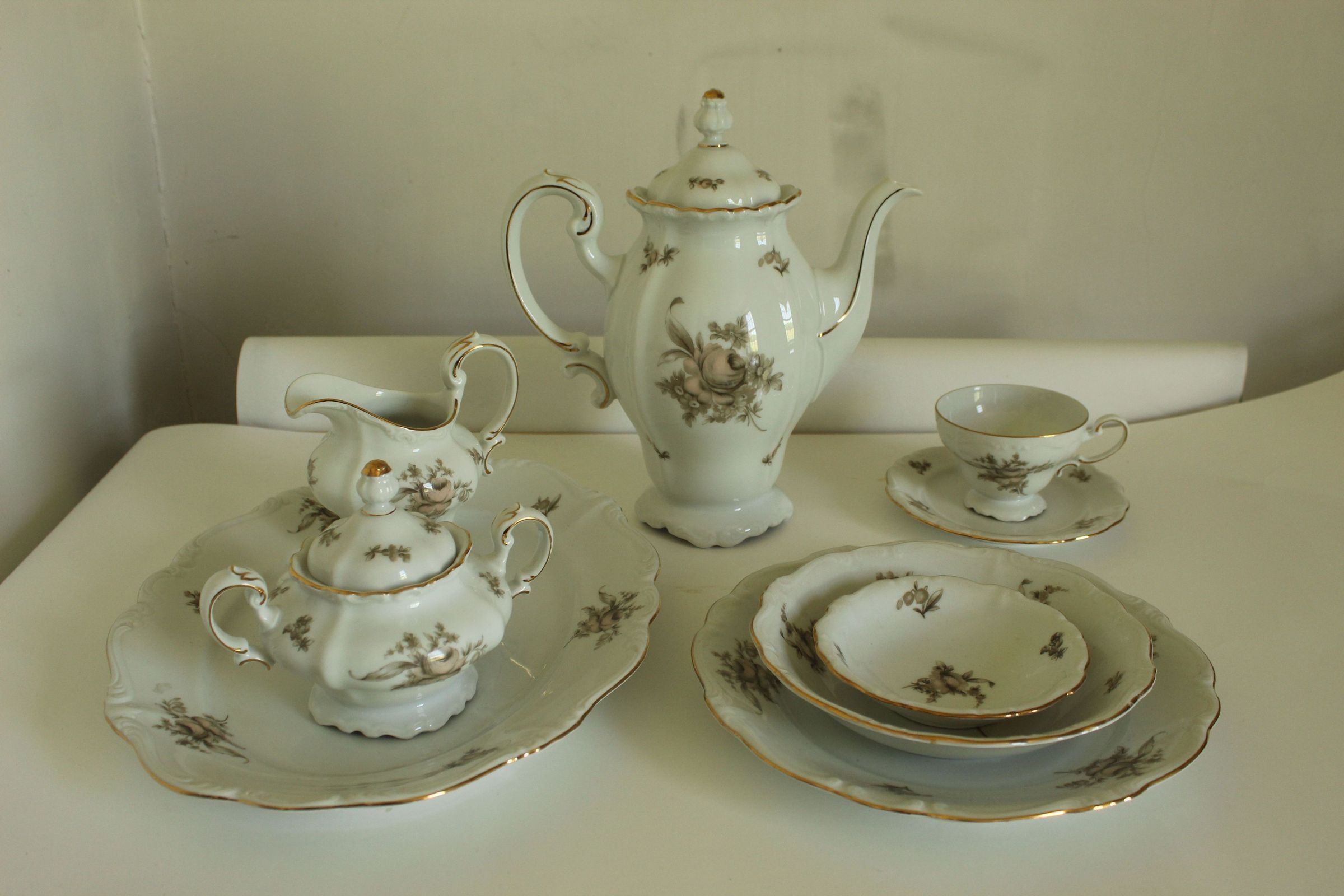 China set with dusty rose pattern. Includes 4 dinner plates, 4 large bowls, 5 small bowls, 5 teacups, 3 saucers, 6 dessert plates, 1 vegetable bowl with lid, 1 gravy boat, 1 serving platter, 1 sugar bowl, 1 cream pitcher, and 1 teapot. One teacup has been broken and repaired and should not be used.Cataloged By