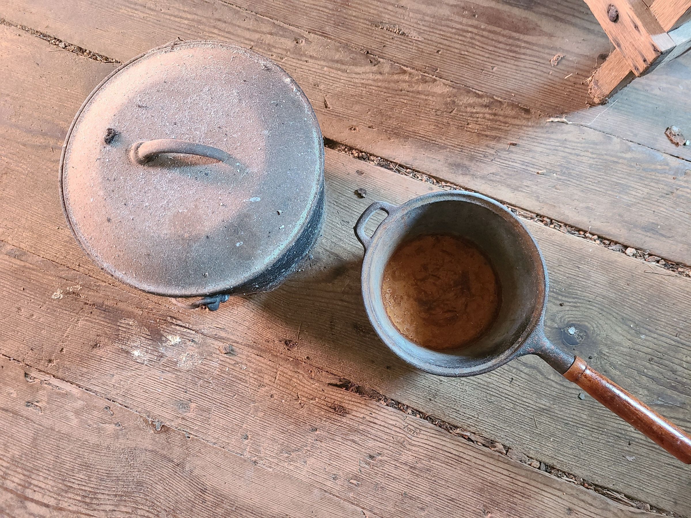 Two cast iron pots, one with long handle, other with lidCollection