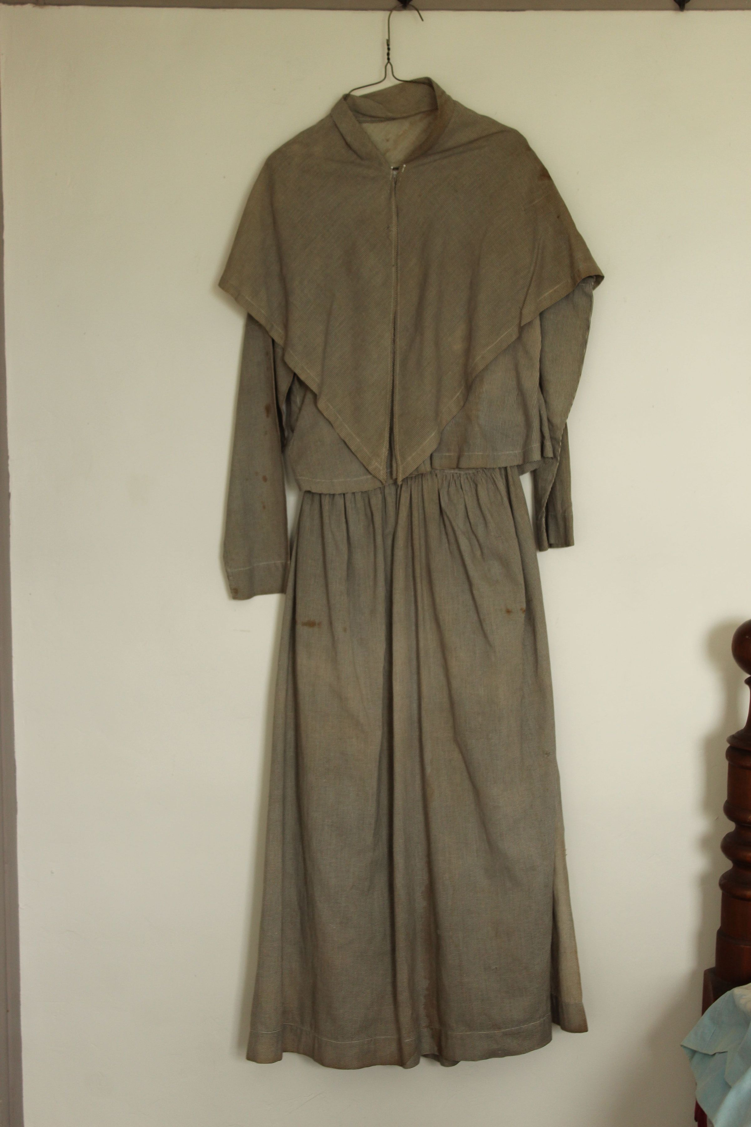 Gray cape dress in the Brethren style. Approximately mid-19th century. Held onto the wearer with straight pins.