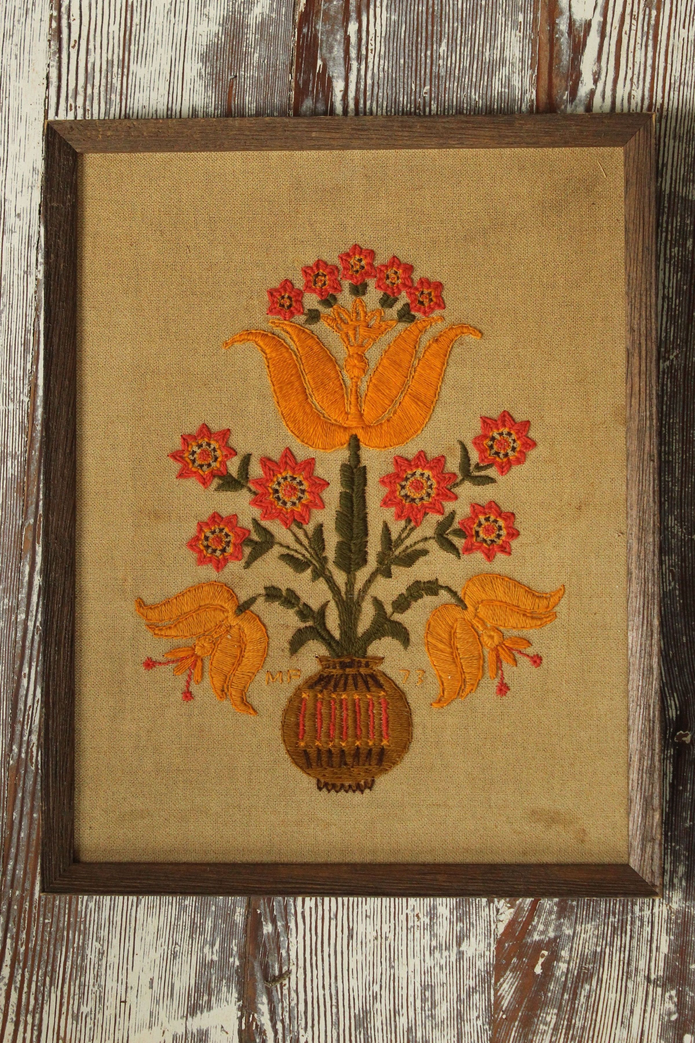 Embroidered wall hanging, framed, embroidery thread on burlap