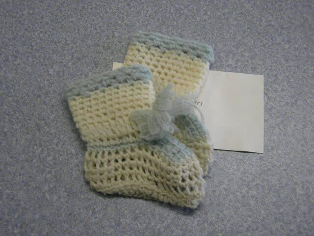 off-white crocheted booties, trimmed in blueCollection