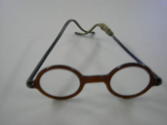 old eyeglasses, brown circular lenses with black handles, left has string wrapped around it, wrapped in blue and white striped fabricAcquisition