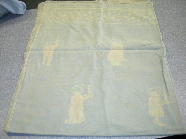 cotton blanket, printed with stars and children holding candles, white bindingTextile Type