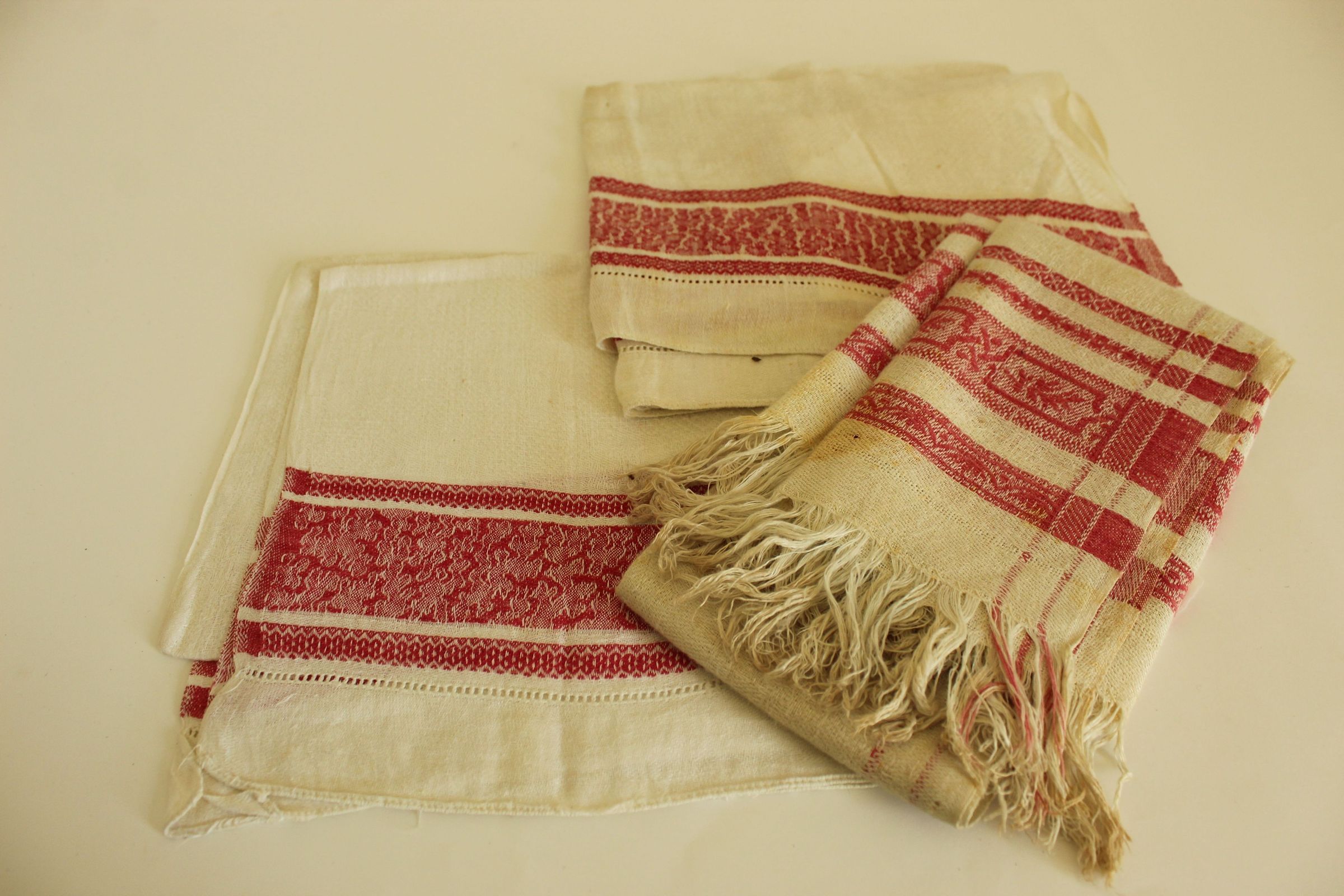 3 linens with red embroidered borders, 2 with hemmed edges, one with fringed edge