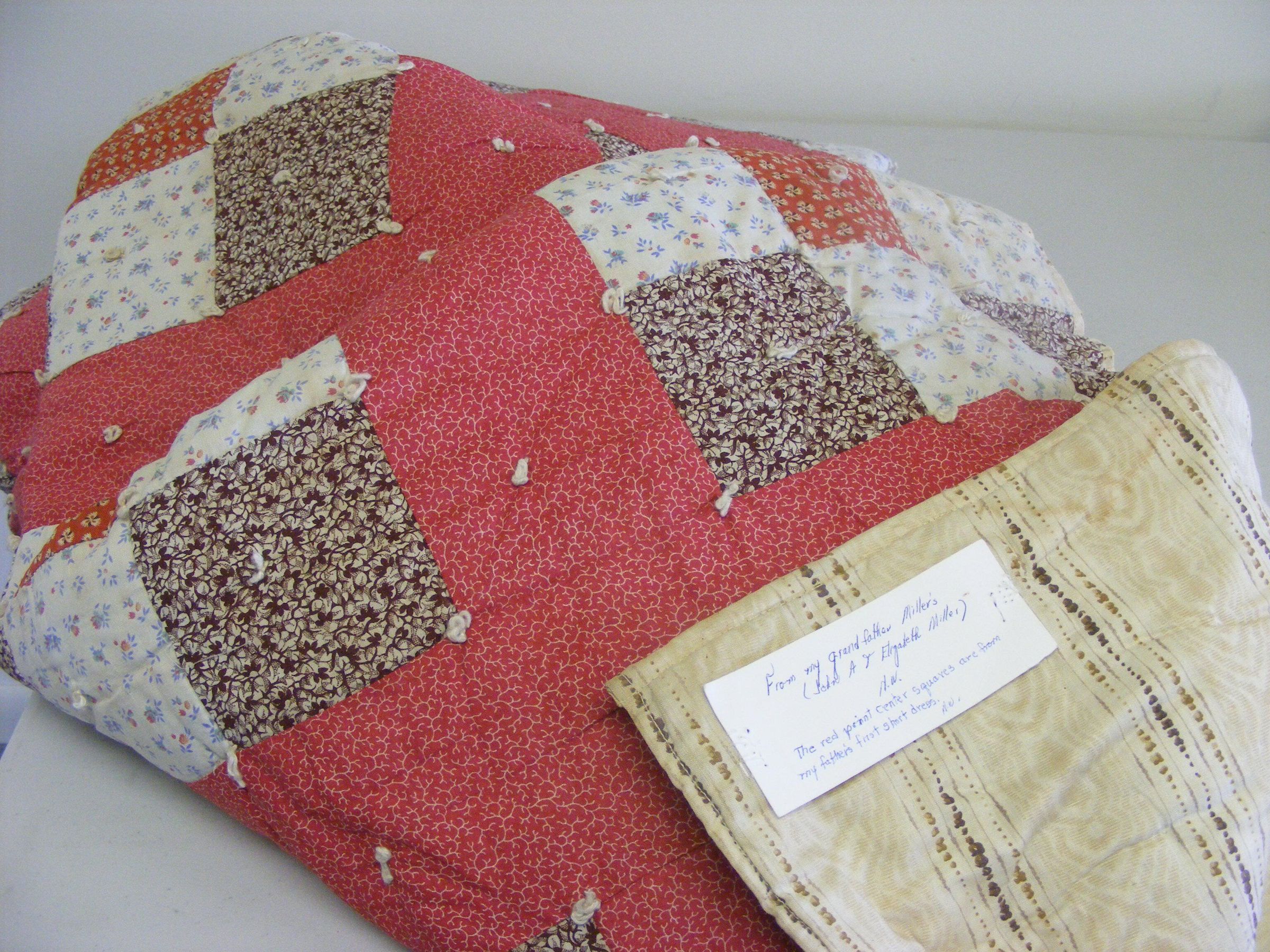 pieced square separated by red strips, knotted, one piece tan backingUse