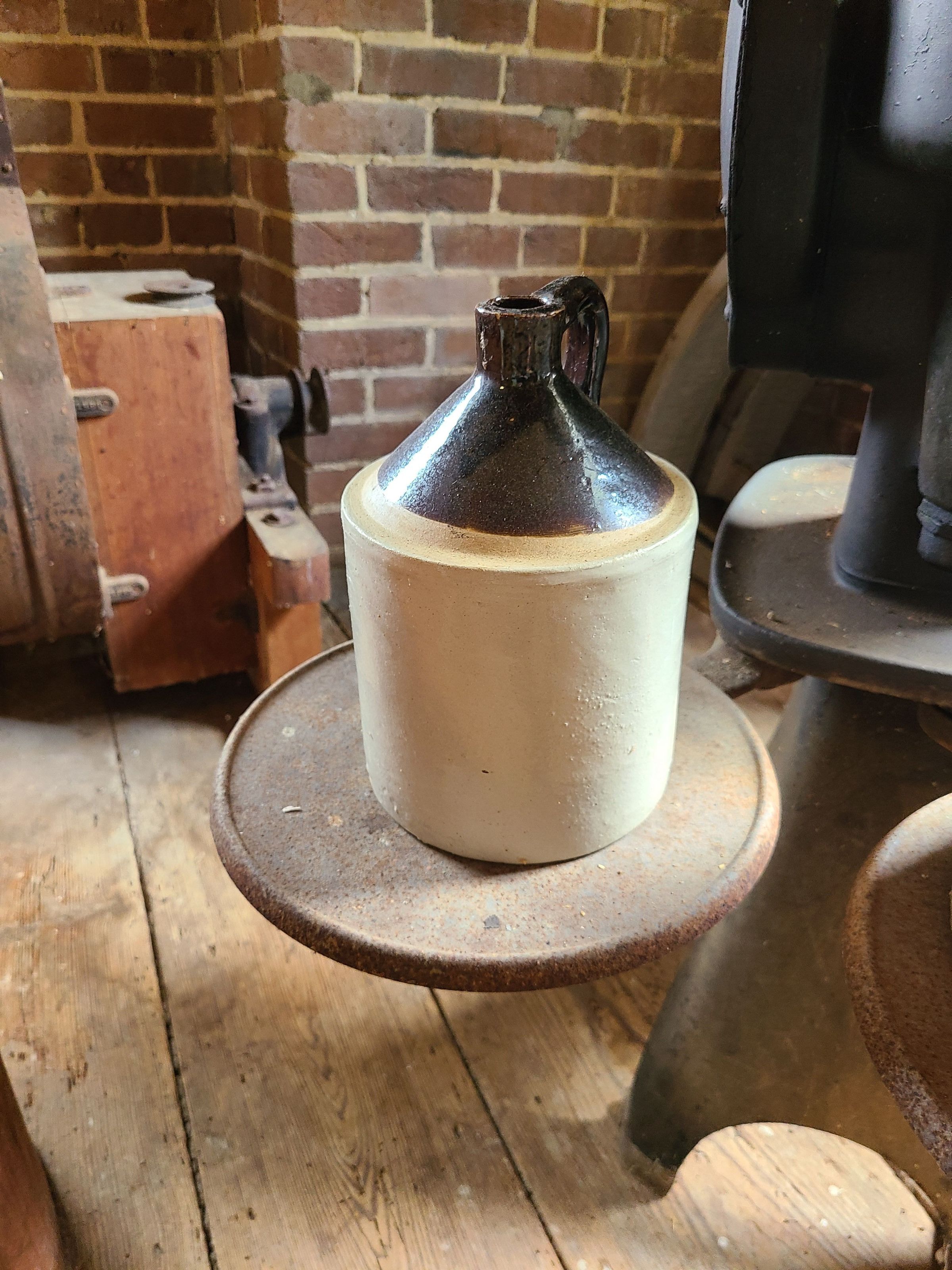 small brown and white jug with handle