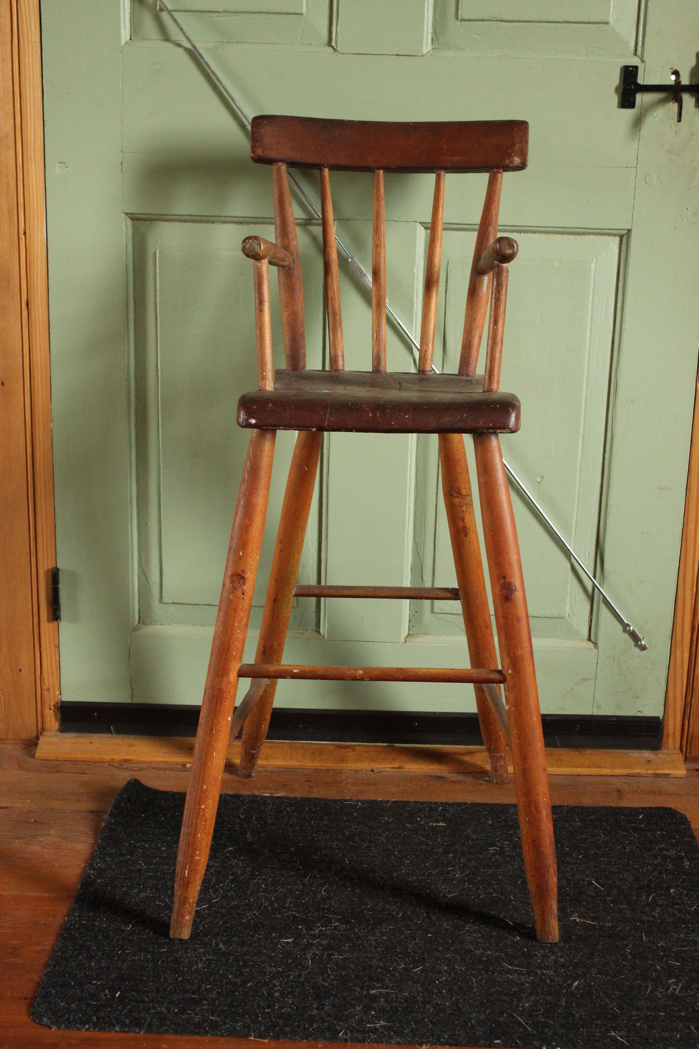 High chair, Brunk family, 1840s. Mildred Kraus was told by her parents Joseph and Hannah Brunk, that her grandfather, Elias Brunk, born July 2, 1856, sat in this high chair when he was a child. Since Elias was the sixth child born to John and Anna Brunk, it is possible that this chair was made for their first born, Samuel Brunk, born on January 8, 1843. In 2019, the estimated age of this chair is around 175 years old.Cataloged By