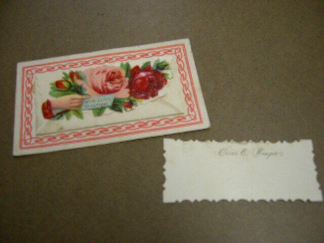 Oscar E. Wenger calling card with envelope, envelope design shows red embroidery and flower bouquet, and says "With Love's Greetings"Collection