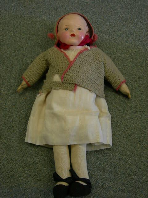 doll with china head with painted eyes that open, cloth body, brown hair, dressed in white dress with knitted hood and sweater (taupe color); black knitted bootiesUse