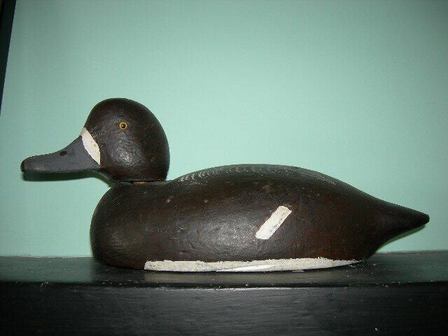 hand carved life-sized duck decoy with lead weights to stabilize it, head detaches