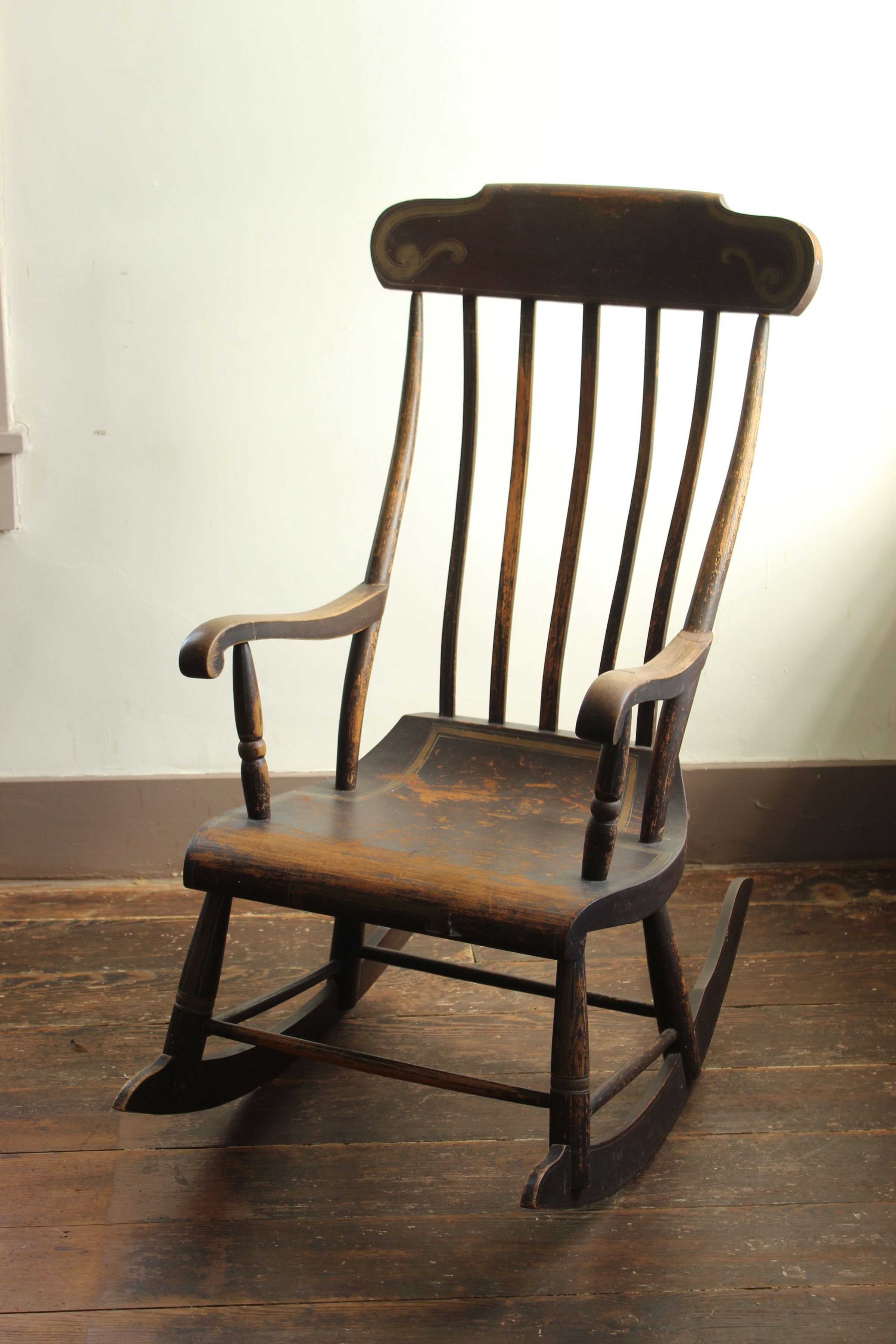 Wooden rocking chair with swirling detailing on the backCataloged By