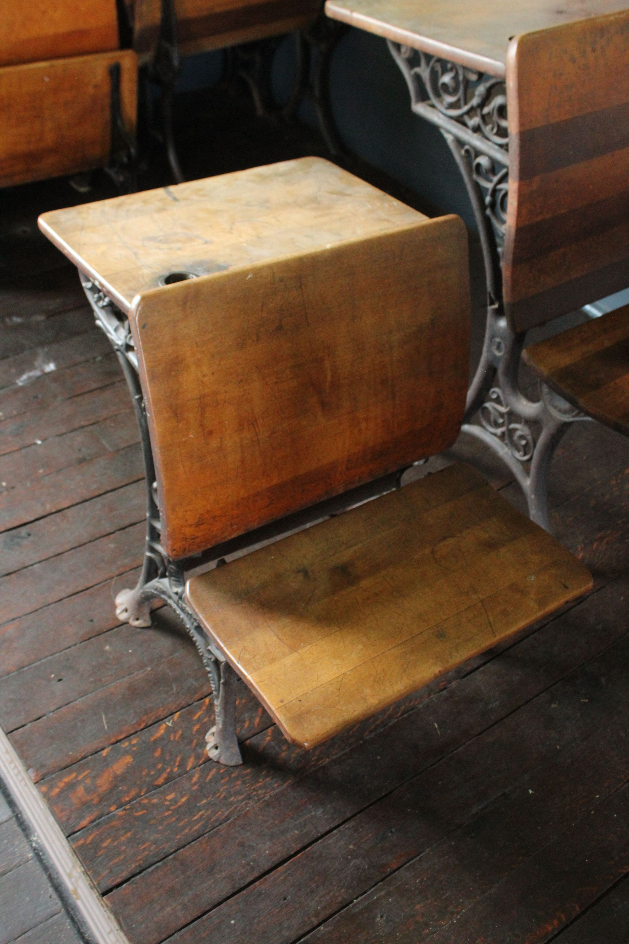 small student desk, seat and table, inkwell and pencil divot
