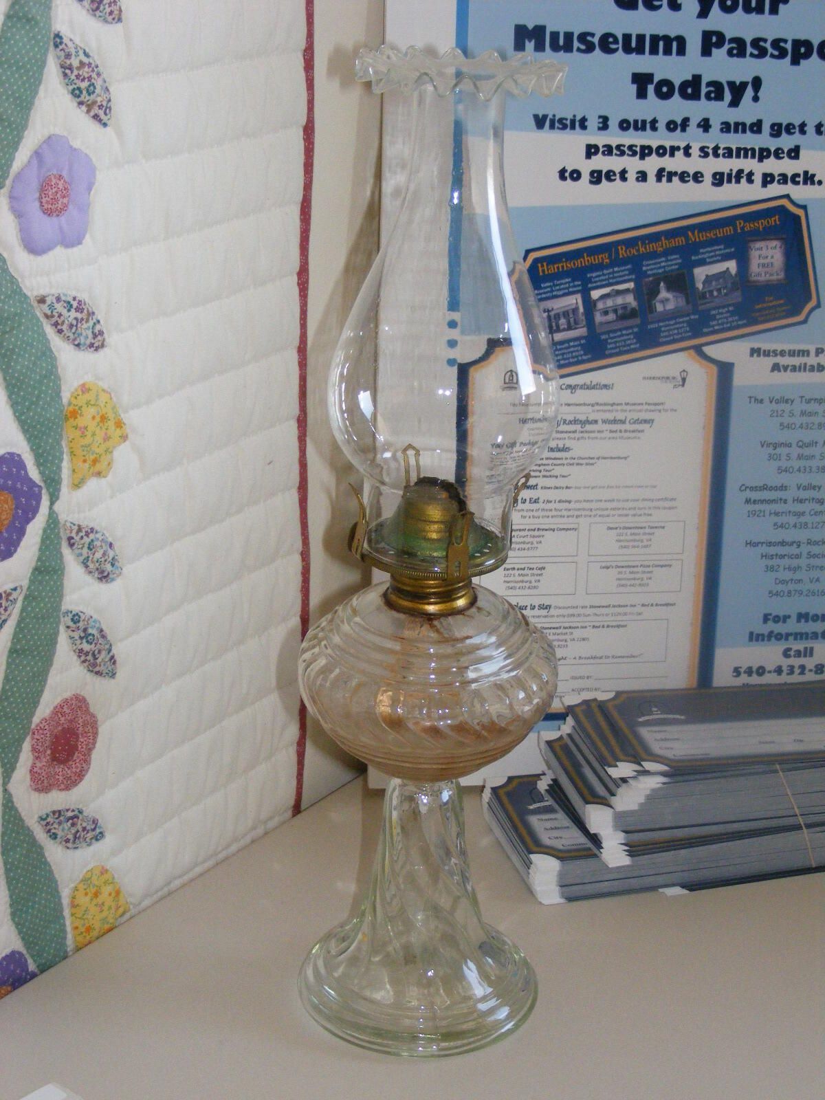 old glass oil lamp with fancy chimney