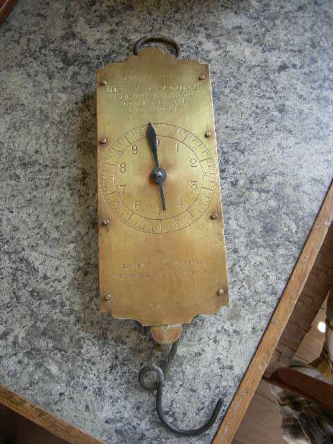 hanging brass from spring type scales, to weigh things up to 30lbs by ounces, scales are signedCataloged By