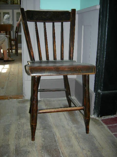chair with 4 legs connected with crossbars, slanted back with 4 spindles, finished with stain