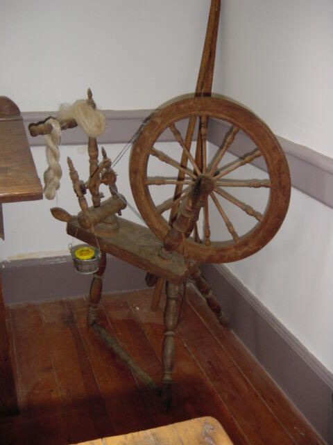spinning wheel with twelve turned spokes; stand with three turned legs