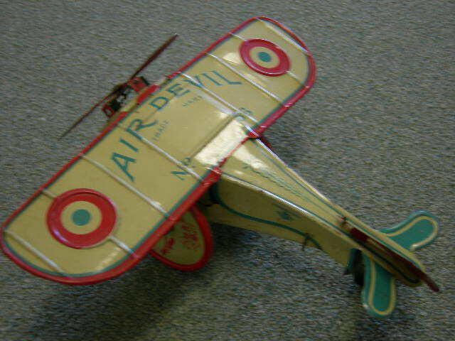 Tin Toy airplane #56 Air Devil, wind-up; rear wheel and wheel under propeller, red picture on outside of wheels w/red rimsCollection