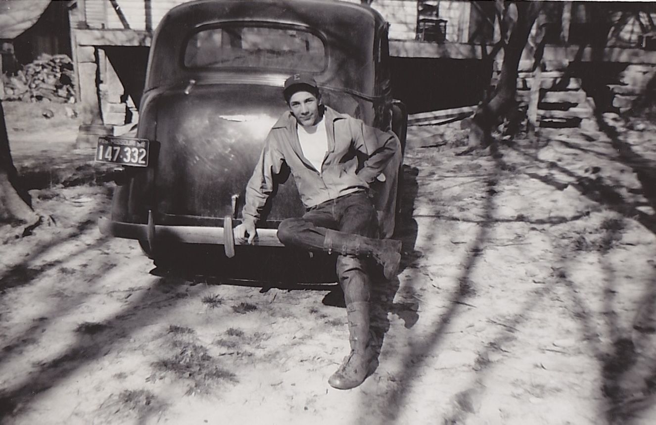 Photograph of Donald Hinkle leaning on car at Fadler Farm