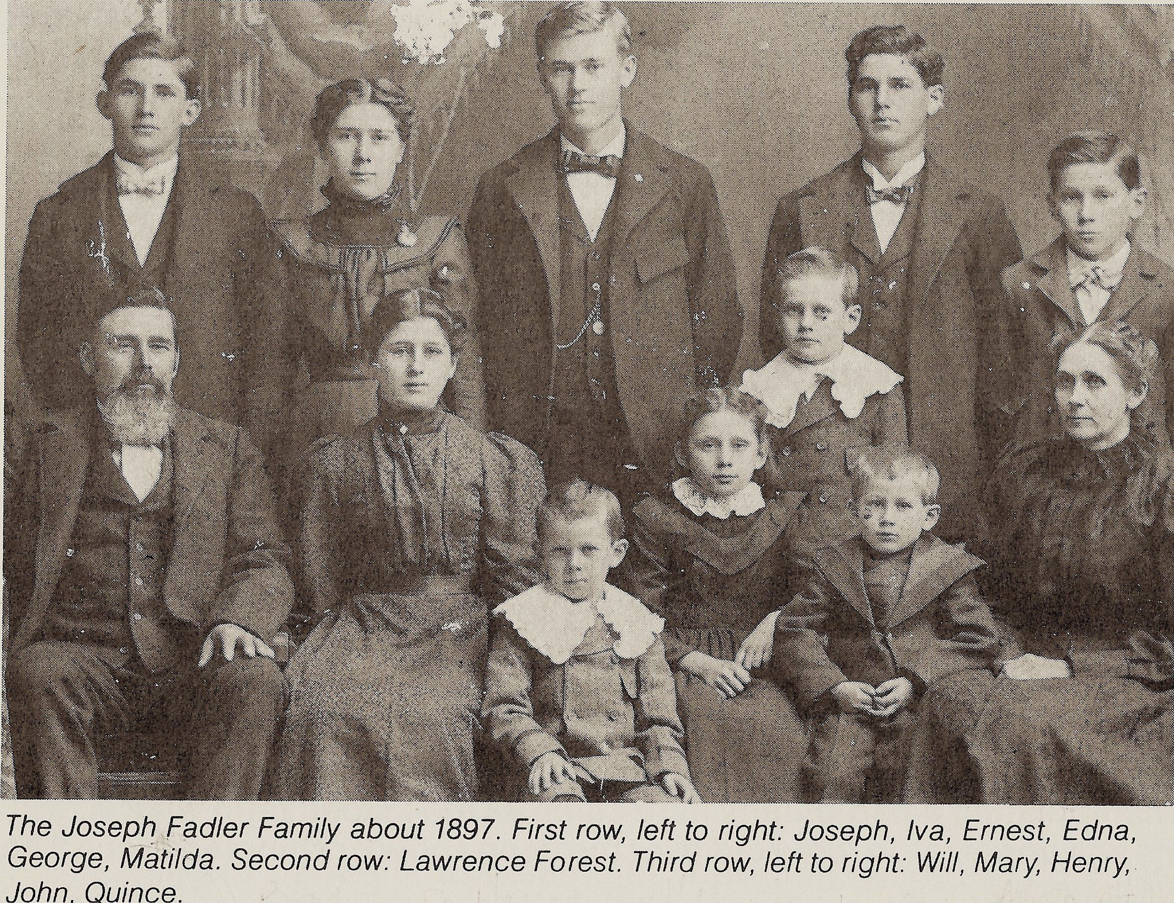 (Left to Right) First Row: Joseph Iva, Ernest, Edna, George, Matilda. Second Row: Lawrence Forest. Third Row: Will, Mary, Henry, John, Quince. circa 1897Collection