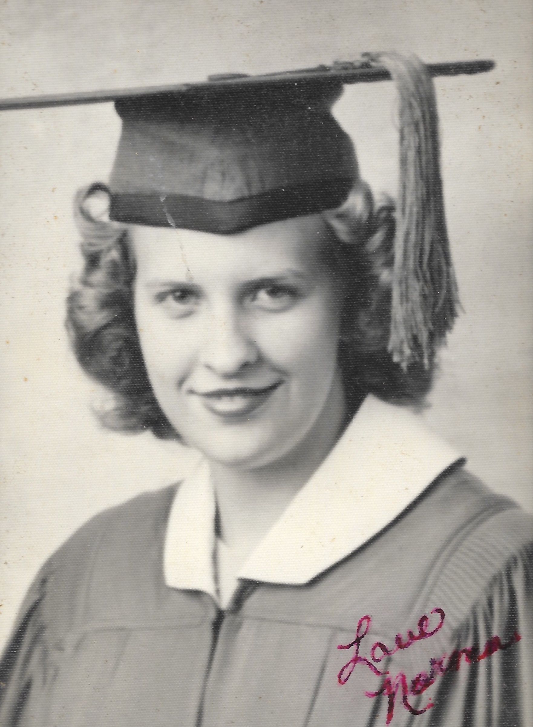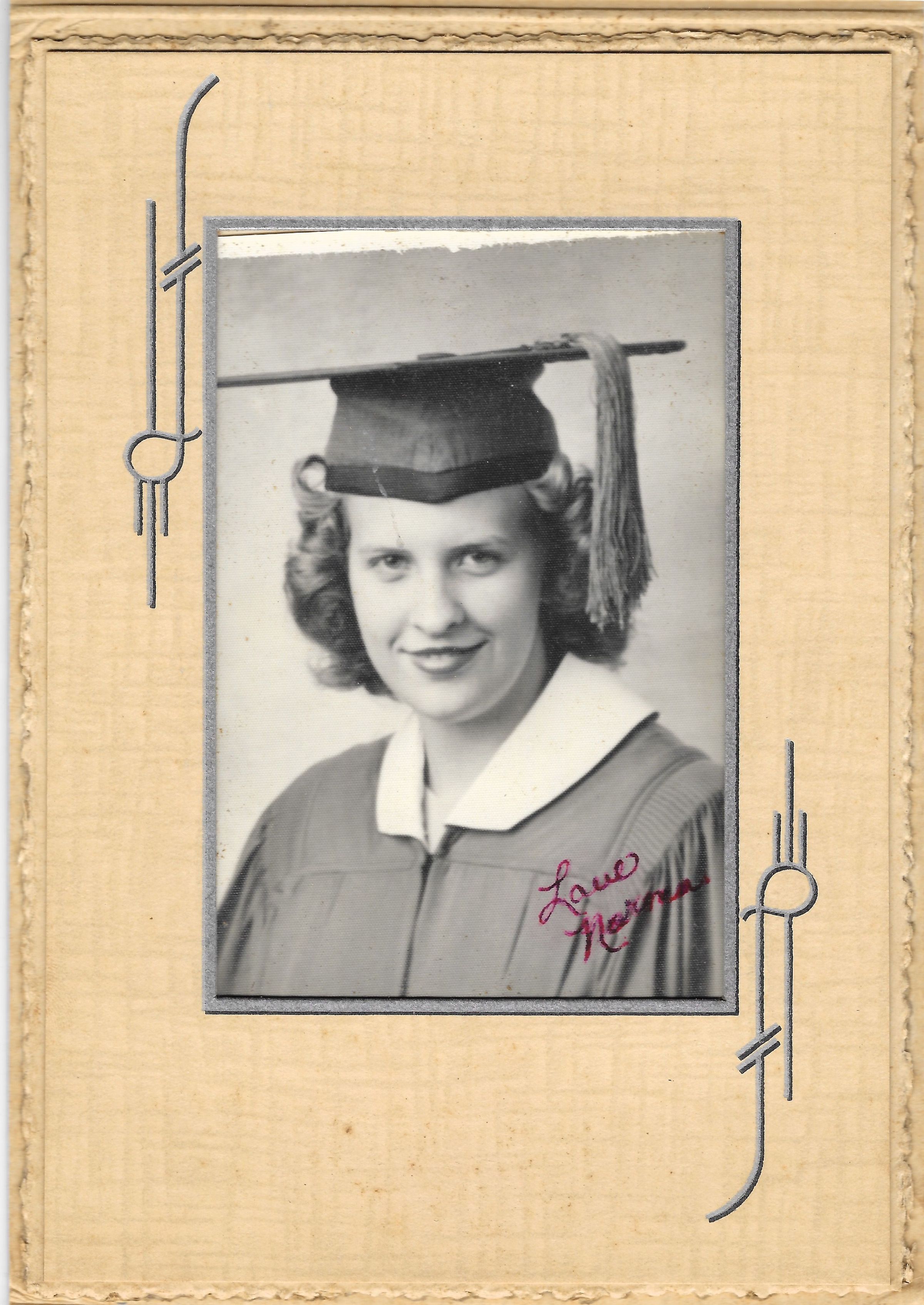 Graduation portrait of Norma June Fadler in her cap and gown.